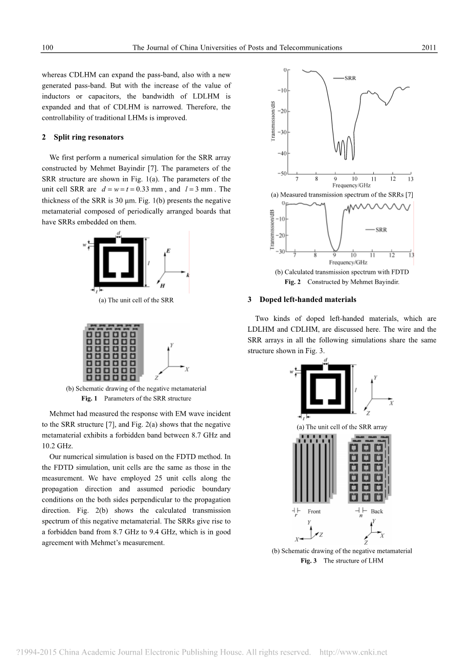 本文研究量化可控掺杂左手材料的概念如下:变化的透射谱可以通过控制电感和电容的插入左手材料值来实现;掺杂左手材料的传输性能由DLHM进行了电感与电容的分析。首先,SRR-only数组的数值模拟是由使用有限差分时域方法(FDTD),并与仿真结果Bayindir测量得到的[7]。一个与Bayindir测量很好的仿真结果使用了DLHMs透射谱的FDTD特征研究。仿真结果表明,LDLHM滤波器通带窄,能使共振削弱相较传统的左手材料。