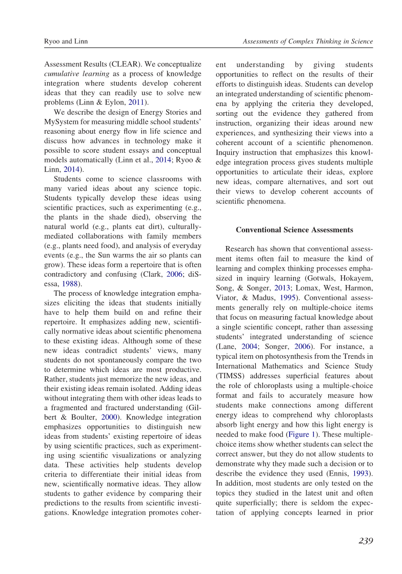 研究表明,传统的评估项目往往无法衡量研究性学习中强调的学习类型和复杂的思维过程(哥特瓦尔斯、霍克耶姆、宋、宋格,2013;洛马克斯、韦斯特、哈蒙、维亚托和马杜斯,1995年)。.传统的评估通常依赖于多项选择项目,这些项目侧重于测量单个科学概念的实际知识,而不是评估学生对科学的综合理解(莱恩,2004年;宋格,2006年)。例如,国际数学与科学研究趋势(TIMSS)中关于光合作用的一个典型项目,使用多项选择格式,阐述了叶绿体作用的超级特征,未能准确测量学生如何在不同的能量观念之间建立联系,以理解叶绿体为什么吸收光能以及如何吸收光能制造食物需要这种光能(图1)。这些多回音项目显示学生是否能够选择正确答案,但它们不允许学生证明他们为什么做出这样的决定或描述他们使用的证据(恩尼斯,1993年)。此外,大多数学生只接受他们在最新单元所学主题的测试,而且通常是非常特别的;很少有人期望应用之前所学的概念龙和林恩对科学材料中复杂思维的评估。因此,当代的评估很少衡量连贯的想法或累积的学习。