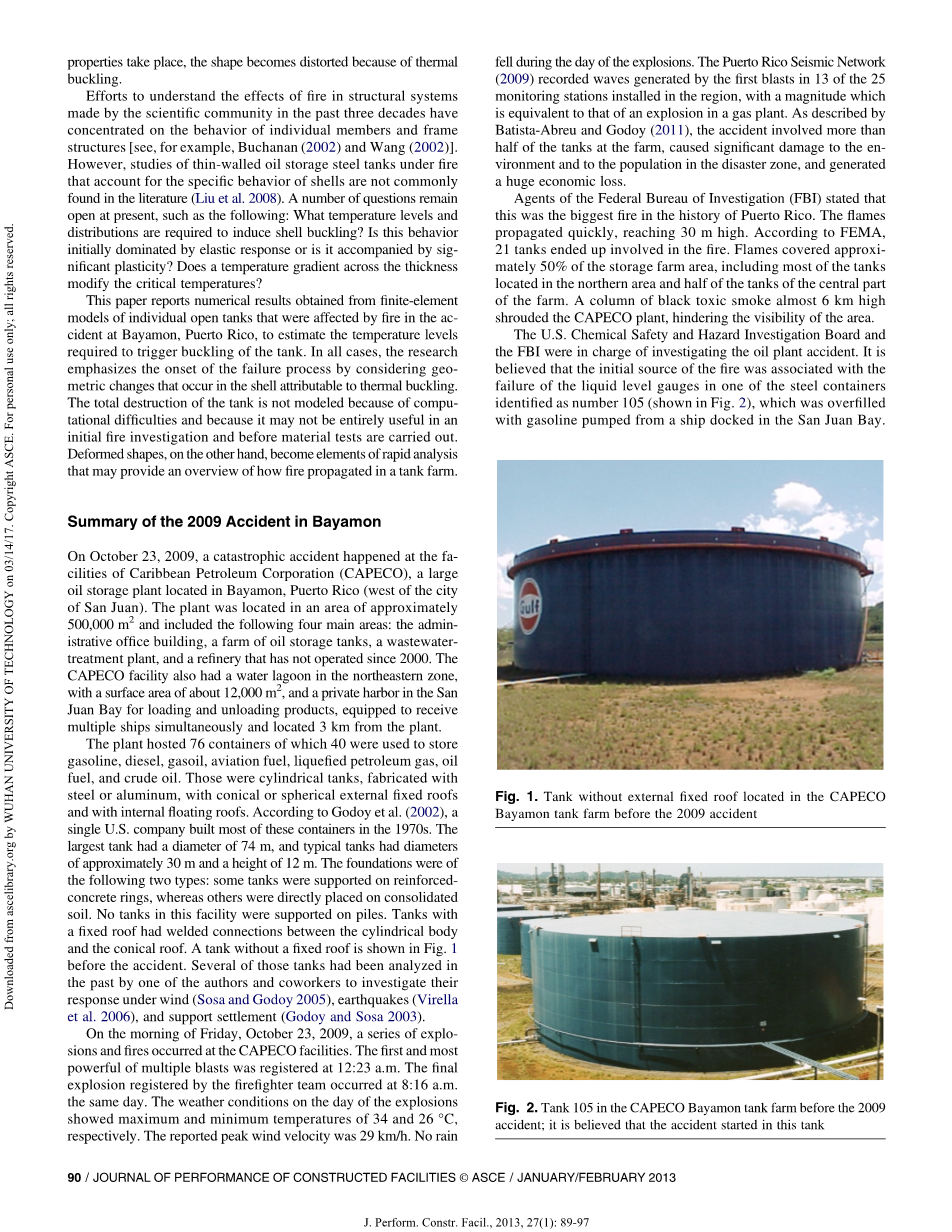 在2009年10月份,此次事故造成了二十一座储油罐的毁坏。(Batista Abreu和戈多伊2011)。通过调查发现一个共同的特征是大多数的这类事故都是对火灾在油库中的传播导致油库的重建产生困难产生了深远的影响的。因为火会破坏最明显依据。在一次火灾调查中,受火影响的油罐在发生火灾事故的这个过程结束时,可能会有十分严重的破坏程度,以致用最后的储油罐的破坏程度信息来作为指示事故的来源,会产生很大的困难。另一方面,有可能有摄影记录(如2009波多黎各事故的情况下)的油罐会记录各级变形归属于火灾不同的时间,这些证据可能对火灾之后的重建工作提供有用的信息。然而,油罐扭曲的形状和他们之间的联系不是不证自明的,它需要仔细研究油罐壳体变形的形状和观察了解油罐在不同火灾场景。