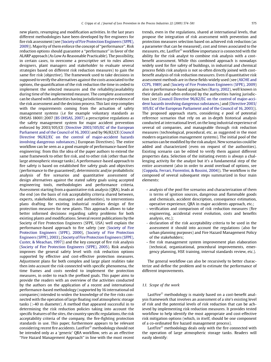 在翻新和改良的新工厂中,与特定事故情景相关的火灾风险分析已成为确定实际安全水平,确保设计期间的有效保护能力(也为了避免昂贵的重新设计)以及有效地确定防火标准和特点的基本规范。在过去几年中,消防工程师已经开发了不同的火灾风险评估方法(见消防工程师协会(SFPE),2009))。 他们中的大多数坚持“成效”的观念。降低风险的选择应该保证“成效”有利于ALARP方法(低至合理切实可行)。在某些情况下,改变对规则的设置可以允许设计者、工厂经理和利益相关人员对不同的风险降低措施来评估策略以获得相同的火灾风险(目标)。用于做出决定的框架应该根据与选项相关的成本来确定替代方案,量化风险减少量以实施所选措施的时间以及在实施措施期间的可靠性/可用性。完整的评估可以与具有风险评估和决策过程的管理机构共享。 最后一步符合安全管理系统(即例如OHSAS 18001:2007的自愿性标准(BS OHSAS,2007))的要求,作为2003/105/2007年实施的重大事故预防安全管理体系的规定性条例, CE(欧洲议会和理事会2003年第106 / EC号指令,2003年)和96/82 / CE(关于控制涉及危险物质的重大事故危险的理事会指令96/82 / EC)欧洲 指令)。整个工作流程可以看作是性能化设计的消防工程中一个很好的例子:从本篇论文作者的想法,扩展相同的框架到其他火灾风险和其他风险(大型常压储罐除外)。 性能化设计的消防安全方法是在已建立的消防安全目的和目标(保证的性能),火灾情景的确定性和/或概率分析以及使用公认的工程工具、方法和性能标准的基础上,对所描述安全目标的设计方案进行定量评估。从定量风险分析(QRA)开始,最终形成(根据专家、利益相关者、管理者和当局之间共享的风险可接受性标准),现有工业制定的干预计划设计新工厂的防火措施。这种方法允许对现有工厂进行修改的安全问题做出更明确的决定。 消防工程师学会(SFPE,USA)最近发表的几篇论文很好地解释了性能化设计的消防安全方法(见消防工程师协会(SFPE),2000年),(消防工程师协会(SFPE) 2003),(消防工程师协会(SFPE),Custer和Meachan,1997年))和火灾风险分析的关键概念(消防工程师协会(SFPE),2005年)。风险分析通过有效和成本效益的保护措施支持的风险降低方法,提高了安全级别。对复杂和大型工厂实际的调整计划应该考虑到现场的风险、实施保护措施所需的时间框架和成本相关的风险,以便达到相应目标,。本文旨在向读者概述作者在应用最近和国际性能化设计的方法(由16个国际石油公司支持)上方面开展的活动,目的是扩大与大型浮顶油罐操作相关的火灾风险知识(直径gt; 40米)。在考虑到场地的具体特征、国家具体法规、公司风险可接受的标准、所使用的灭火保护标准等方面,成功确定降低风险政策的方法。此外,本文还考虑了近期火灾事故的影响。LastFire 方法不应只作为“通用”QRA工作流程,将其作为符合最新趋势的'火灾危险管理办法',即使在国际一级的条例中,也建议将风险评估纳入基于已实现的风险减少的风险评估(作为可衡量的参数)、成本和时间等措施的选择。LastFire工作流程的重要性与风险分析师将风险分析与成本效益评估相结合的能力有关。虽然这种组合方法现在广泛用于建筑物的消防安全,但在工业和化学领域中,风险分析并不直接与降低风险措施的成本效益分析相结合。即使在这些领域中广泛使用的定量风险评估方法(参见(AICHE和CCPS,1989)和(消防工程师协会(SFPE),2009),还有性能化设计的方法,并且经常由有管辖权的当局执行(见(关于控制涉及危险物质的重大事故危险的理事会指令96/82 / EC)和欧洲议会和理事会的指令2003/105 / ,2003))。拟议的方法开始,考虑到在国际层面进行的深入历史分析,依靠几家石油公司的长期工业经验,并通过减少风险措施(技术,程序等如最现代的组织管理系统中所建议的)。风险分析师可以修改初始经营的方案,可以添加和改变新方案(甚至可以根据学术权威的要求)。起始事件的选择对于分析者来说总是具有挑战性的活动,但是它是整个评估的基本步骤(为了避免选项过载,参见(Coppola,Ferrari,Fiorentini,&Rossini,2004))。 工作流程由以下四个主要部分总结的几个后续步骤组成:
