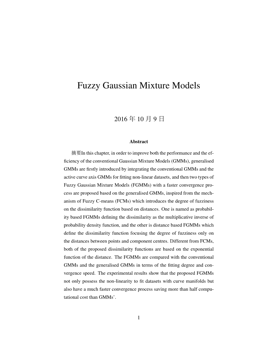 在这一章中,为了提高传统高斯混合模型(GMMs)的性能和效率,通过集成传统GMMs与主动曲线轴的GMMs拟合非线性数据集的的方式,首先提出广义GMMs。接着,在广义GMMs的基础上,受到引进基于距离的相异性函数上模糊度的模糊C均值聚类算法(FCMS)的启示,提出了两类具有更快收敛过程的模糊高斯混合模型(FGMMs)。一种被命名为基于概率的GMMs,它把相异性定义为概率密度函数的倒数;而另一种是基于距离的GMMs,它定义了相异性函数,把模糊度仅集中于点到组件中心的距离。不同于模糊C均值聚类算法,两种被提出的相异性函数都是建立在距离的指数函数之上。就拟合度与收敛速度两方面而言,FGMMs和传统的GMMs及广义的GMMs相比,实验结果显示,所提出的FGMMs不仅拥有非线性度以拟合曲线流形的数据集,而且还有更快的收敛过程,相比于GMMs节省了一半以上的计算成本。