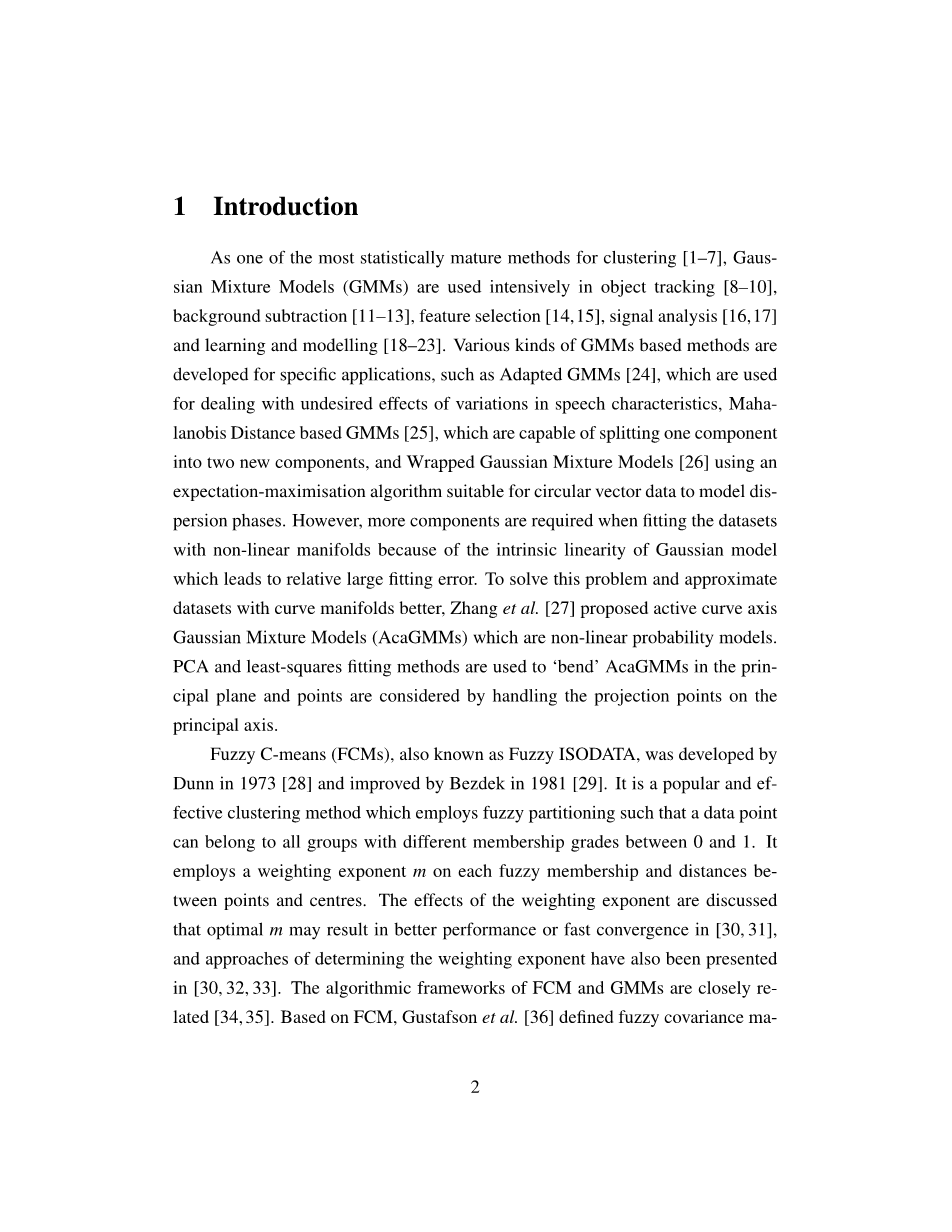 模糊C均值聚类算法又被称作模糊迭代自组织数据分析算法,在1973年[28]由邓恩提出并在1981年[29]被贝兹德克完善。它是一种流行并有效的聚类方法,通过采用模糊划分使得一个数据点能够属于在0和1之间产生不同隶属度的所有群组。它在每一个模糊隶属度及点到中心的距离采用了一个加权指数m。而加权指数的作用是最优的m会产生最好的性能或是更快的收敛性[30,31],并且确定加权指数的方法也已经被提出[30,32,33]。FCM和GMMs的算法框架紧密相关[34,35]。基于FCM,古斯塔夫森等人定义了聚类的模糊协方差矩阵,这意味着相同数据集的不同聚类可能有不同的几何形状。为了明确不同聚类的几何形状,特兰等人对GMMs做了进一步的优化为实现说话人识别,它把FCM函数中的距离细分为密度函数的负对数。因此,成员和距离间的关系从指数关系转移到线性关系,但是它错误的用指数距离参数来构想高斯密度函数。海瑟薇[38]给出了一个概括性的解释,GMMs的EM算法是一种硬均值聚类算法不公正的说法。市桥等人[39]提出了一种FCM的优化版本,并由模糊目标函数上的Kullaback-Leibler(KL)信息进行正则化。KLFCM和GMMs间的关系以及二者的比较一直被人们讨论[39,40]。作为一个KLFCM的算法变体,一种在模糊聚类原理下用以有限混合模型拟合的通用方法被提出并且被运用于三类有限混合模型[41]中来提升它们的性能。