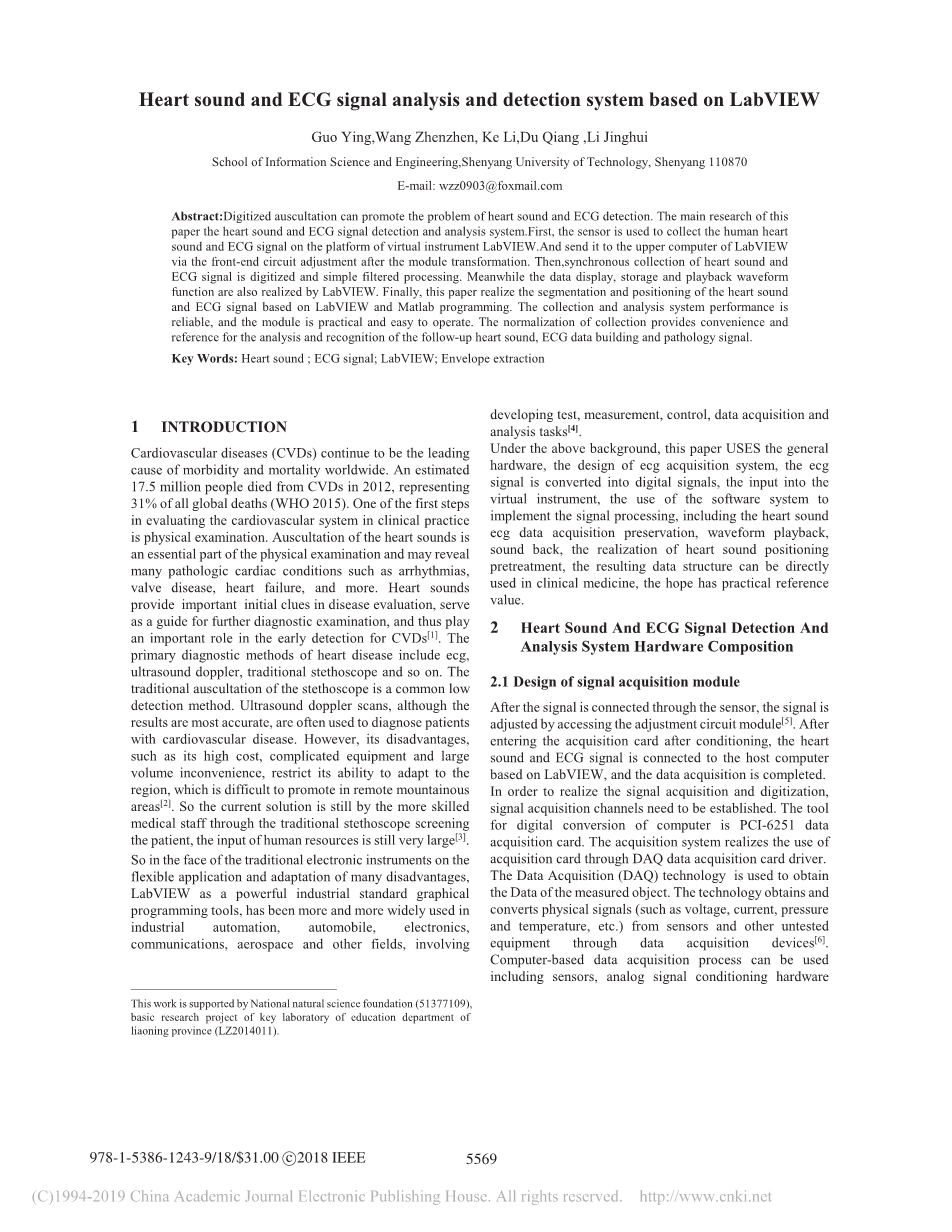 心血管疾病(CVDs)仍然是全球发病率和死亡率的主要原因。 2012年估计有1750万人死于心血管疾病,占全球死亡人数的31%(世卫组织,2015年)。在临床实践中评估心血管系统的第一步是体检。心脏听诊是体格检查的重要组成部分,可能会发现许多病理性心脏病,如心律失常,瓣膜病,心力衰竭等。心音在疾病评估中提供了重要的初步线索,可作为进一步诊断检查的指导,从而在早期发现心血管疾病中发挥重要作用[1]。心脏病的主要诊断方法包括心电图,超声多普勒,传统听诊器等。听诊器的传统听诊是一种常见的低检测方法。超声多普勒扫描虽然结果最准确,但通常用于诊断心血管疾病患者。但是,其成本高,设备复杂,体积大,不便等缺点,限制了其适应该地区的能力,难以在偏远山区推广[2]。所以目前的解决方案仍然是由较熟练的医务人员通过传统的听诊器筛查患者,人力资源的投入仍然非常大[3]。因此面对传统电子仪器在灵活应用和适应上的诸多弊端,LabVIEW作为一种功能强大的工业标准图形化编程工具,已越来越广泛应用于工业自动化,汽车,电子,通信,航空航天等领域。涉及开发测试,测量,控制,数据采集和分析任务[4]。