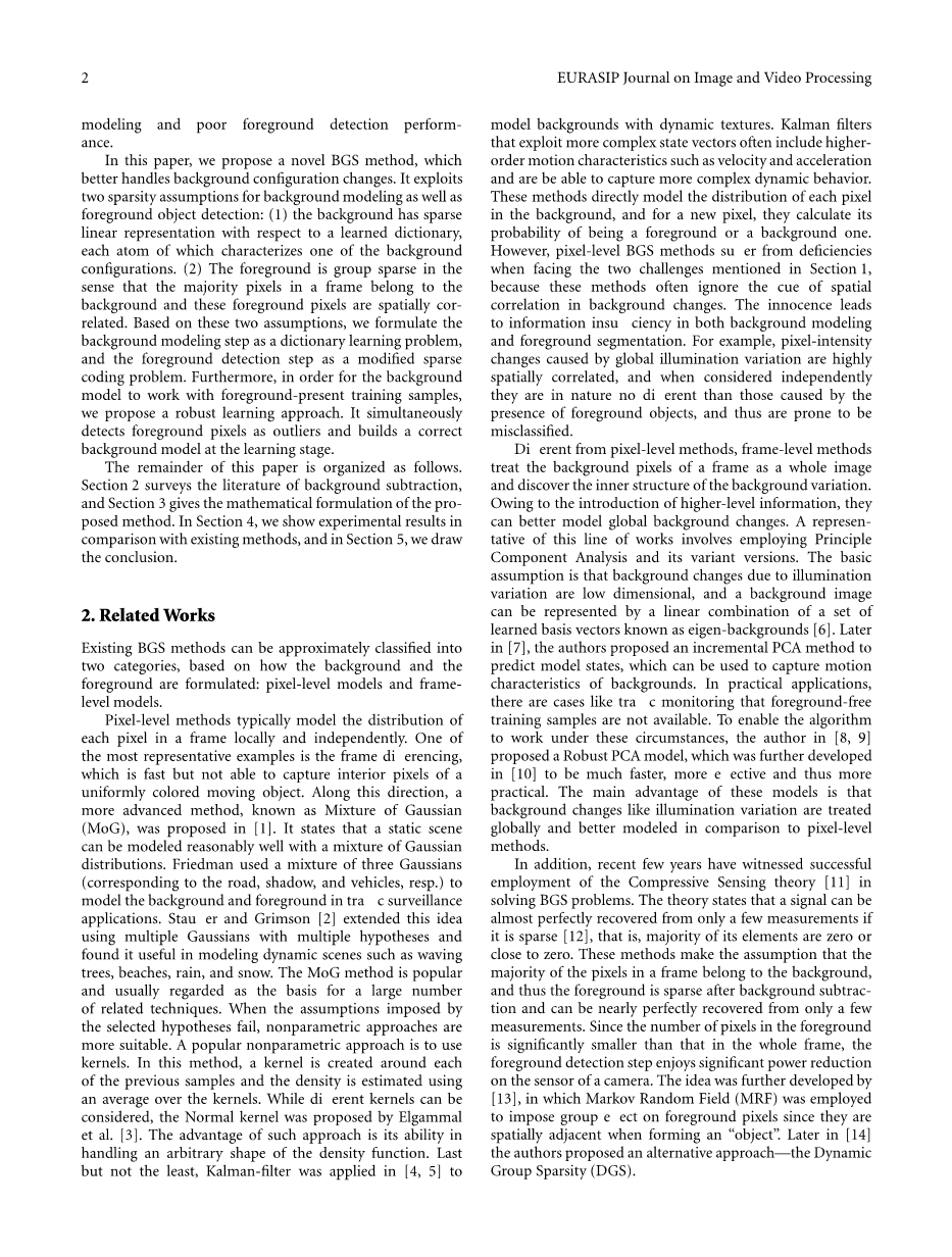 本文的其余部分组织如下。第2节调查背景减法的文献,第3节给出的数学公式的拟方法。在第4节中,我们与现有的方法相比,实验结果,并在第5节,我们得出的结论。