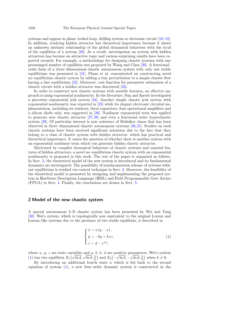 由混沌系统和隐藏吸引的不寻常特征,一种新的不平衡混沌系统的复杂动力学性质与指数非线性效应在这项工作中提出。本文的其余部分安排如下,在第二节新系统的理论模型被引入,并对它的根本动态变化进行了研究。第三节,系统同步方案的可能性与平衡性是通过控制技术研究。此外,在第四节,是否可行的理论模型被制定和实施的建议在硬件描述语言(HDL)和现场可编程门阵列(FPGA)下提出的透射电镜。最后,第五节得出一些结论。