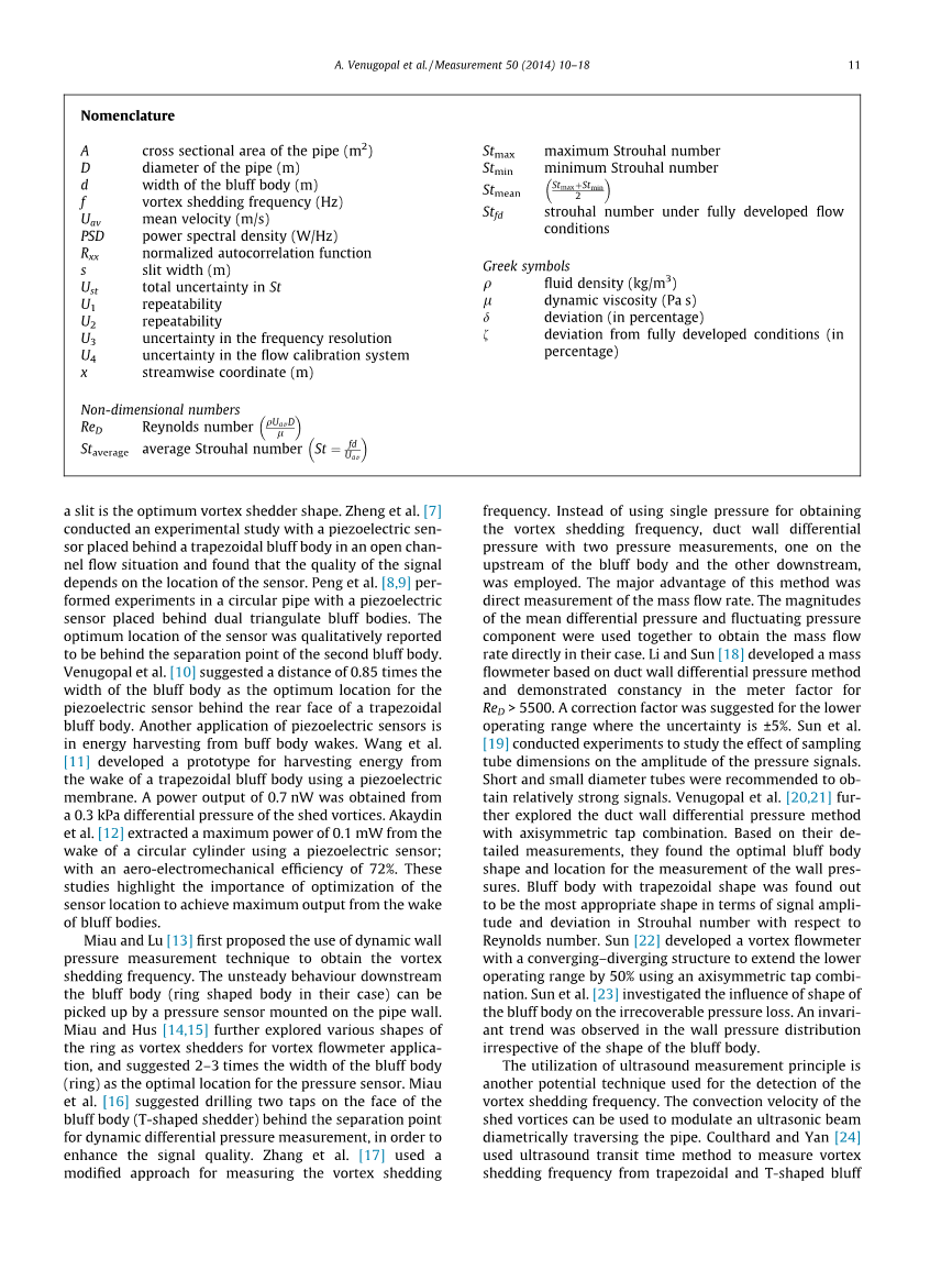 超声波测量原理的应用是另一种用于检测涡旋脱落频率的潜在技术。可以使用棚涡流的对流速度来调制直径横穿管道的超声波束。库特哈德和严 [24] 采用超声波传播时间法测量梯形和Tshaped虚张声的涡旋脱落频率身体。卢娜和纽豪斯 [25] 使用脉冲比率频率多普勒超声来测量圆柱体后面的涡旋。Hans等人 [26–28] 测量三角形和梯形钝体后面的涡旋脱落频率。 他们观察到超声波测量受涡流发生器后缘后面的次级涡流的影响。涡流检测的超声波方法被发现对与漩涡相关的湍流脉动敏感,在涡流发生器后面的涡流涡流。这基本上需要修改钝体的后缘以防止二次涡流的产生。