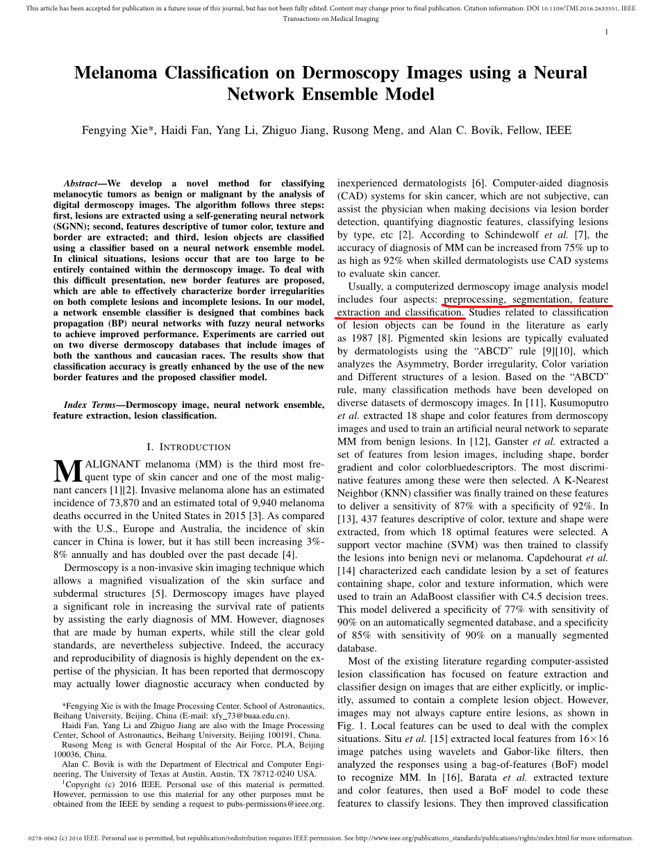 摘要-通过分析数字皮肤镜图像我们开发了一种分类黑素肿瘤良恶性的新方法。该算法按照以下三个步骤:第一步,使用自生成神经网络(SGNN)来提取病变;第二步,提取肿瘤颜色、纹理和边界描述特征;第三步,使用基于神经网络集成模型的分类器分类病变物体。在临床情况下,病变太大而不能完全被包含在皮肤镜图像中。为了处理这个困难的情况,我们提出新的边界特征,其可以在完全和不完全病变图像上有效描述边界不规则性。我们模型设计了一种网络集成分类器,其将BP神经网络和模糊神经网络结合起来实现了更好的表现。试验在两个不同的皮肤镜数据库中进行,这两个数据库包含了黄种人和白种人皮肤数据。结果显示,通过新边界特征的使用和提出的分类模型,分类精度极大提高。