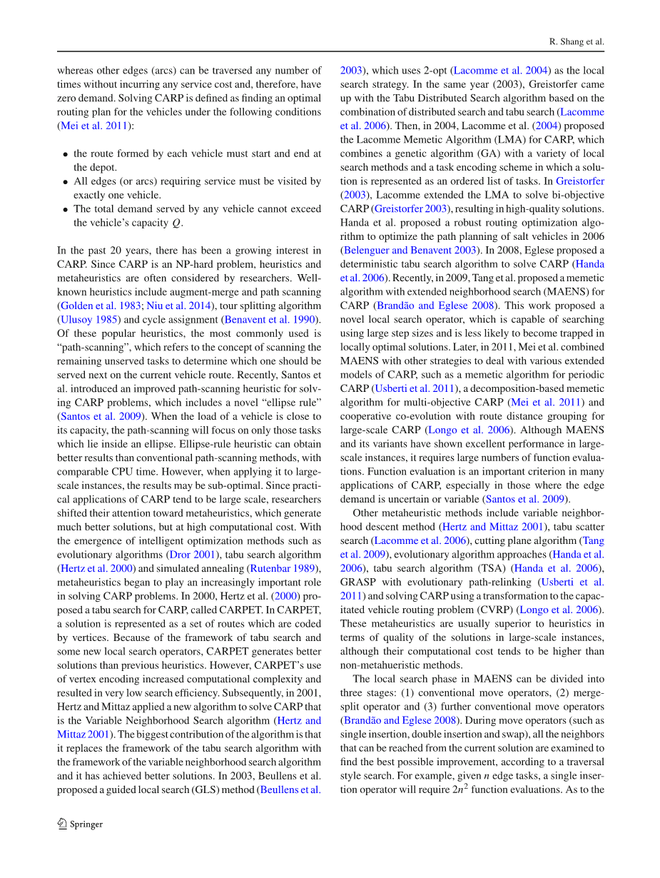 在过去的20年里,人们对限量弧路由问题的兴趣越来越大。由于限量弧路由问题是一个NP难题,启发和启发式通常被研究者考虑。众所周知的启发式算法包括增强合并和路径扫描、旅游分裂算法和循环任务。这些流行的启发式,最常用的是“路径扫描”,它是指扫描的概念剩余的服务任务,以确定哪一个应该是在当前路径下。最近,Santos[3]等介绍了一种改进的启发式算法求解路径扫描,其中包括一种新的“椭圆规则”。当车辆的负载接近其容量时,路径扫描将只专注于在椭圆范围内的那些任务。在一定的处理时间内,椭圆规则启发式算法可以得到比传统路径扫描方法更好的结果;然而,当它应用到大规模的情况下,结果可能是次优。由于限量弧路由问题的实际应用往往是大型的,研究人员把他们的注意力转向启发式,以高成本的代价产生更好的解。随着智能优化方法的出现,如进化算法、禁忌搜索算法和模拟退火算法,在解决限量弧路由问题上启发式开始扮演着越来越重要的作用。在2000,Hertz等为CARP[4]提出了一种禁忌搜索算法称为CARPET;在CARPET中,解决方案被表示为一组通过点组成的编码。由于禁忌搜索和一些新的本地搜索算子的框架, CARPET能够产生更好的解相比于以前的启发式。然而,CARPET顶点编码的使用使计算复杂度增加,并且导致了非常低的搜索效率。随后在2001年,Hertz and Mittaz提出了变邻域搜索算法来解决CARP,该算法的最大贡献是它用变邻域搜索算法的框架取代了禁忌搜索算法的框架,并得到了较好的解决方案。在2003年,Beullens[5]等提出了局部搜索(GLS)制导方法,它使用2-opt作为局部搜索策略。在同一年,Greistorfer[6]在禁忌搜索算法和分布式搜索相结合搜索的基础上提出了禁忌的分布式搜索。然后,在2004,Lacomme[7]等人提出了 Lacomme Memetic算法(LMA)来解决CARP,它用各种本地搜索方法和任务的编码方案综合遗传算法令解被表示为一个有序的任务列表。在Greistorfer, Lacomme扩展LMA求解双目标CARP,以产生高质量的解。在2006年Handa[8]等人提出了一种稳健的路由优化算法来优化盐车路径规划。在2008年Eglese提出了确定性的禁忌搜索算法解决CARP。最近,2009年,Tanget等提出了一种扩展邻域搜索的Memetic算法(MAENS)。这项工作提出了一种新的本地搜索算子,这是能够搜索使用大的步长,并且是不太可能陷入局部最优解。后来,在2011年,Meiet[9]等结合MAENS与其他策略手段处理各种CARP的扩展模型,如周期性的Memetic[10]算法、基于多目标分解的CARP和为大型CARP服务的路由距离分组协同进化。虽然MAENS和它的变体在大型的情况下显示性能优良,但它需要大量的功能评估。函数评价是许多CARP应用的重要标准,特别是在那些的边缘需求是不确定的或可变的。