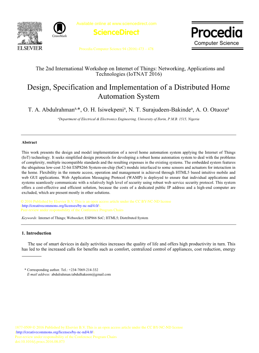 强大且可扩展的架构涉及基于Websocket和JSON的通信协议,通过简单的消息交换节省大量带宽,实现了实时家庭自动化,操作所需的延迟极低,从而节省时间,金钱和空间。虽然,实际连接特性取决于可用的互联网连接强度,即使在相对较差的连接情况下,也保证了系统性能。虽然在互联网中断或离线使用的情况下,在CPE上运行的嵌入式迷你网络和Websocket服务器足以进行持续操作。值得一提的是,这种模型分布式自动化系统已经过测试,完全可以按照设计进行工作,甚至在2015年尼日利亚伊洛林大学的工程项目展览(EPEX)会上获得了一个展览奖。