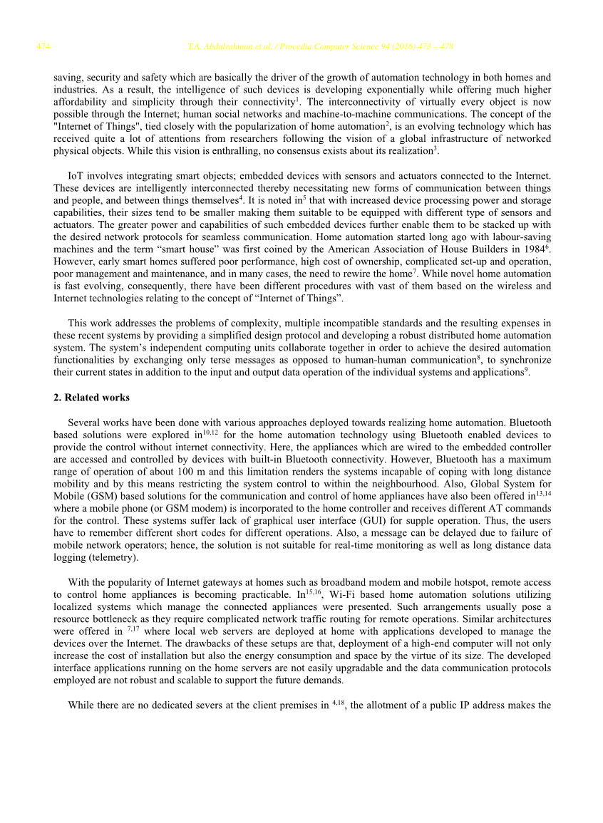 为了实现家庭自动化,已经有了几种成型的解决方案。在参考文献10和12中探讨了针对使用蓝牙设备的家庭自动化技术提供的基于蓝牙的解决方案,提供无需互联网连接的控制。这里,连接到嵌入式控制器的设备由具有内置蓝牙连接的设备访问和控制。然而,蓝牙具有约100m的最大操作范围,并且该限制使得系统不能应付长距离移动,并且通过这种方式将系统控制限制在附近。此外,在参考文献13和14中还提供了用于家用电器的通信和控制的基于全球移动系统(GSM)的解决方案,其中移动电话(或GSM调制解调器)被结合到家庭控制器并且接收用于控制的不同AT命令。这些系统缺乏易于操作的图形用户界面(GUI)。因此,用户必须记住不同操作的不同短码。此外,由于移动网络运营商的故障,消息可能被延迟。因此,该解决方案不适合于实时监测以及长距离数据记录(遥测)。