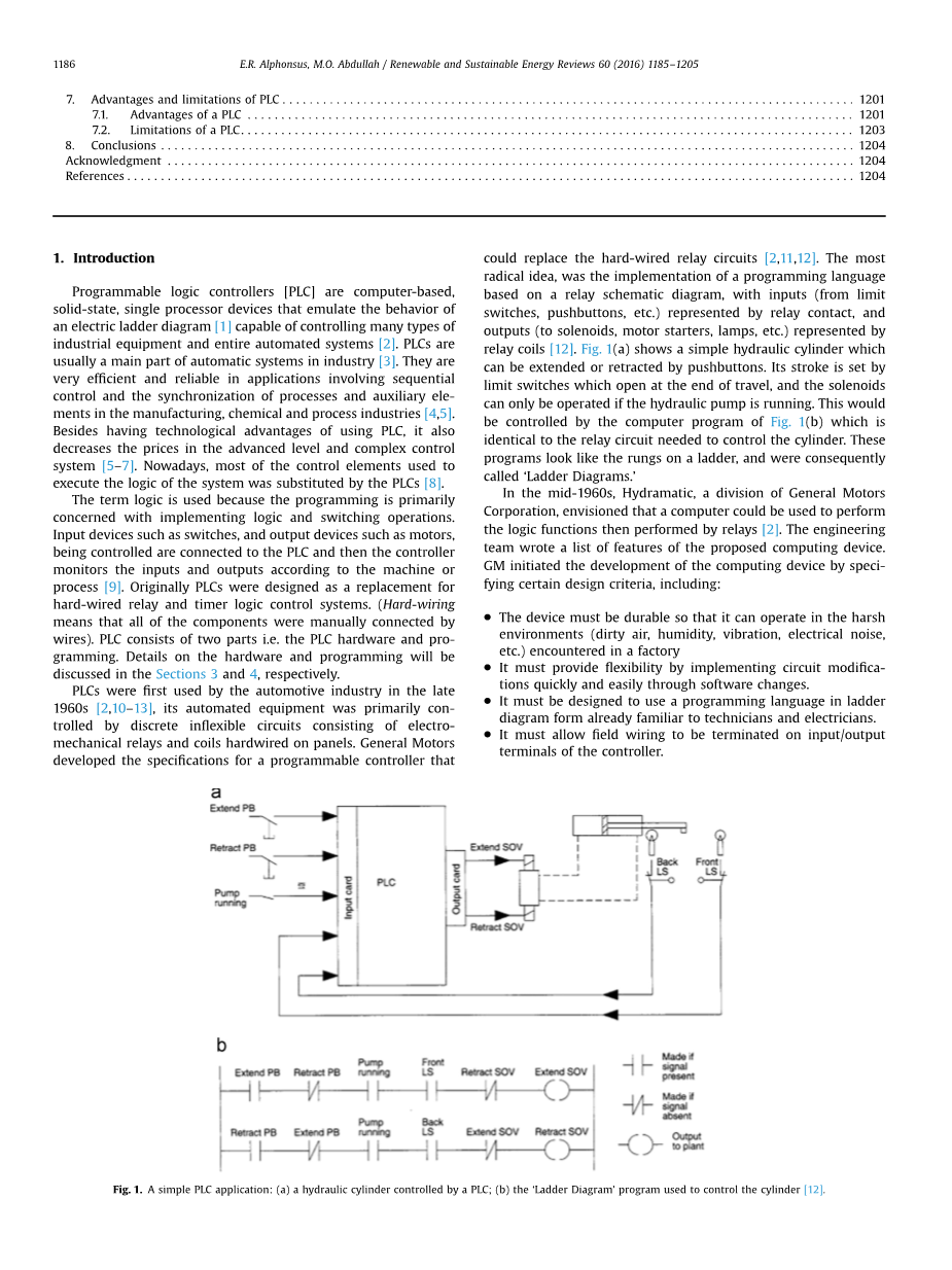 使用术语逻辑,因为编程主要涉及实现逻辑和切换操作。 诸如开关等输入设备和被控制的电动机等输出设备连接到PLC,然后控制器根据机器或过程监控输入和输出[9]。 最初的PLC被设计为硬接线继电器和定时器逻辑控制系统的替代品。 (硬接线意味着所有组件都通过电线手动连接)。 PLC由两部分组成,即PLC硬件和编程。 有关硬件和编程的细节将分别在第3节和第4节中讨论。