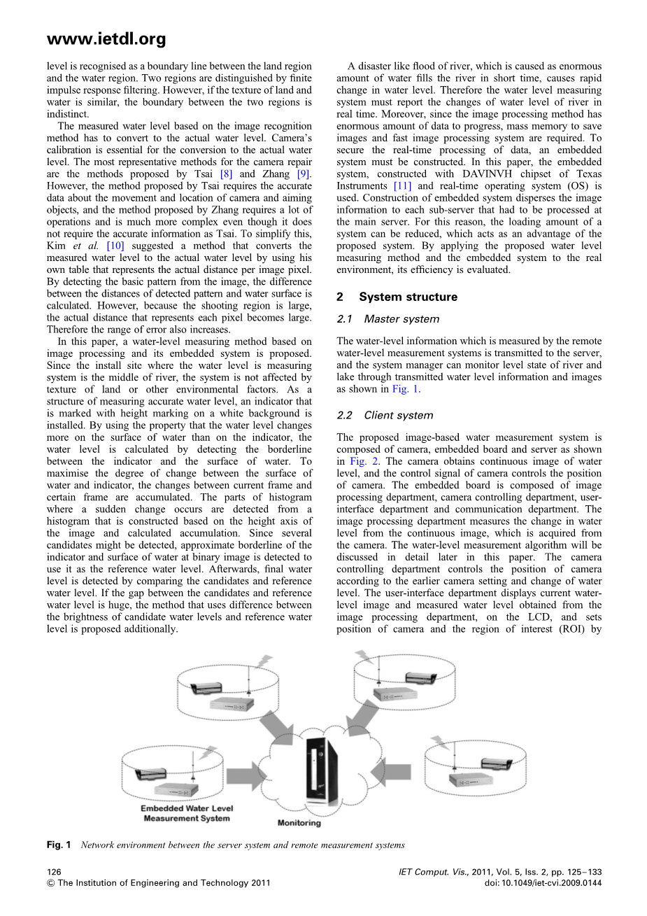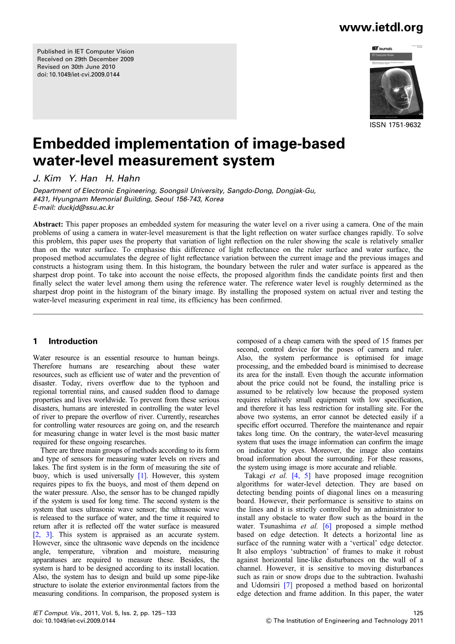 本文提出了基于图像处理及其嵌入式系统的水位测量方法。由于水位测量系统的安装地点是河道中部,系统不受土地质量或其他环境因素的影响为了更加精确地测量水位,安装了在白色背景上标有高度标记的指示器。根据水位在水面上的变化多于指示器的性质,通过检测指示器与水面之间的边界来计算水位。为了最大限度地提高水面和指示器之间的变化程度,可以累积当前帧和某帧之间的变化。基于图像的高度轴和计算的累积构造的直方图中检测发生突然变化的直方图的部分。由于可能检测到几个候选水位,因此将检测到二值图像上的指标和水面的近似边界作参考水位。之后,通过比较候选水位和参考水位来检测最终水位。如果候选水位和参考水位之间的差距很大,则另外提出使用候选水位和参考水位之间的亮度差异的方法。