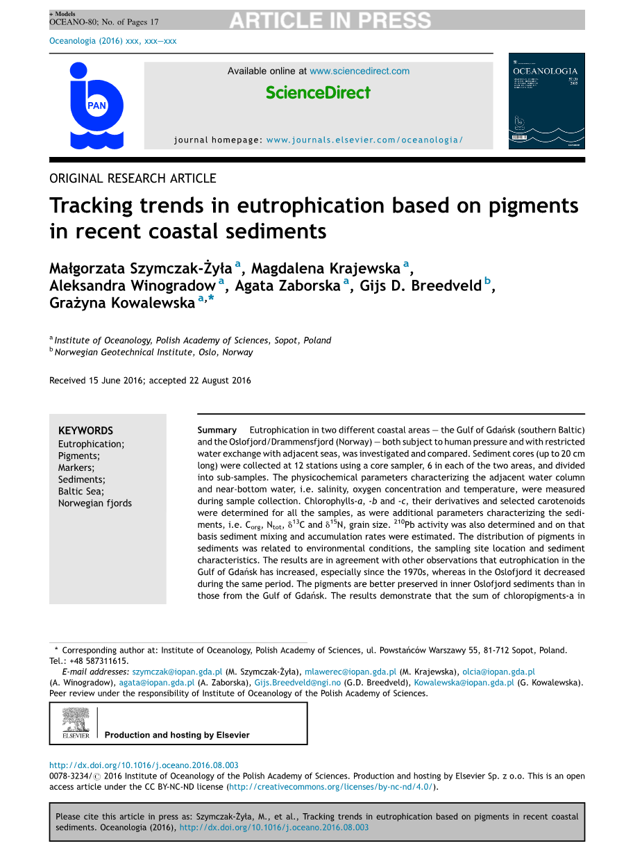富营养化; 颜料; 标记; 沉积物; 波罗的海; 挪威峡湾