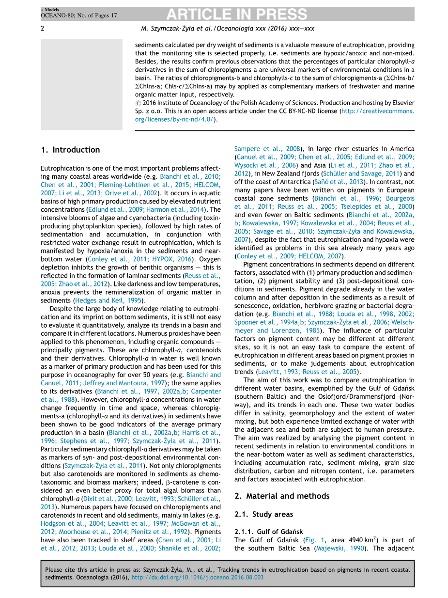 这项工作的目的是比较格但斯克湾(波罗的海南部)和Oslofjord / Drammensfjord(挪威)的不同水域的富营养化状况及其趋势。 这两个水体在盐度,地貌和水混合程度上有所不同,但都与邻近的海域有限的水交换,并且都受到人类压力。 通过分析近期沉积物中与近底水环境条件以及沉积物特征(包括积累速率,沉积物混合,粒度分布,碳氮含量,即参数和相关因素)相关的色素含量富营养化。