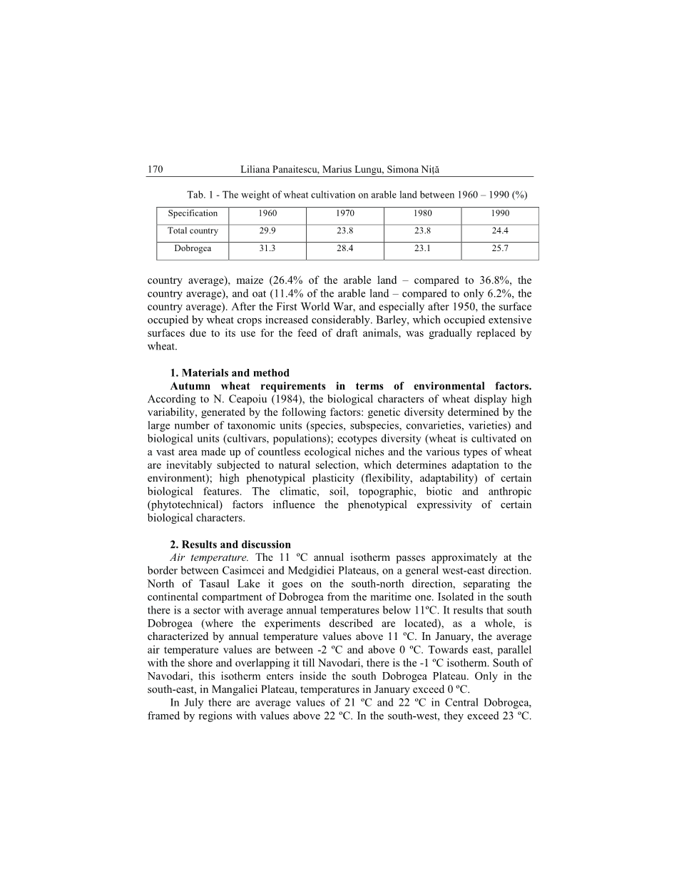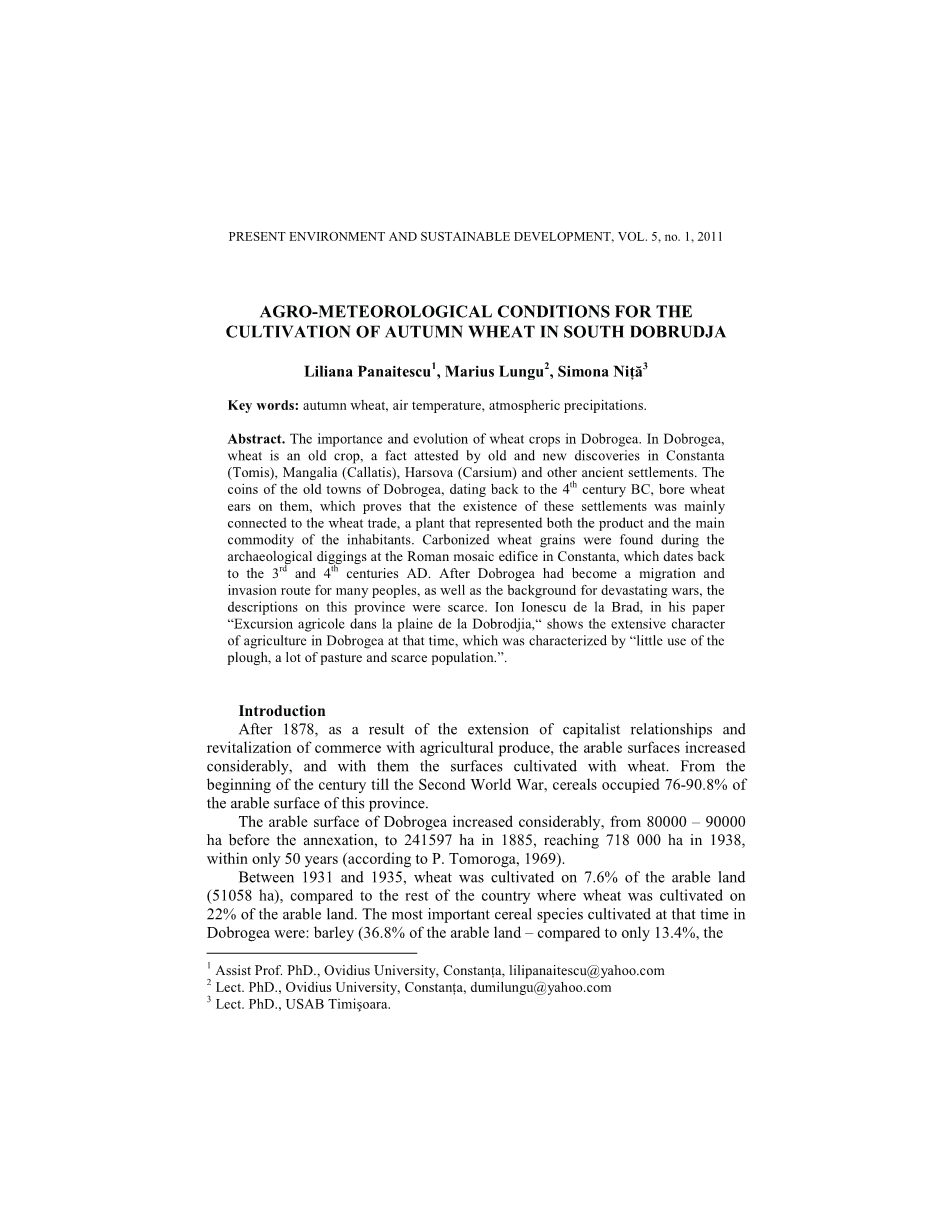 摘要:多布罗吉的小麦作物的重要性和演变。在Dobrogea,小麦是一种古老的作物,在康士坦达(Tomis)、曼格里亚(Callatis)、Harsova (Carsium)和其他古老的聚落中发现了古老的新发现。早在公元前4世纪,多布洛盖古城的硬币上就有小麦的穗,这证明了这些定居点的存在主要是与小麦贸易有关的,这是一种既代表产品又代表居民主要商品的植物。在康斯坦塔的罗马马赛克大厦考古发掘过程中发现了碳化麦粒,这可以追溯到公元三、四世纪。在Dobrogea成为许多民族的迁徙和入侵路线,以及毁灭性战争的背景之后,对这个省的描述很少。在他的论文《远足的阿格里·德·拉·多布罗德加》中,他描述了当时在多布罗盖地区农业的广泛特征,其特点是“很少使用耕地,大量的牧场和稀少的人口”。”