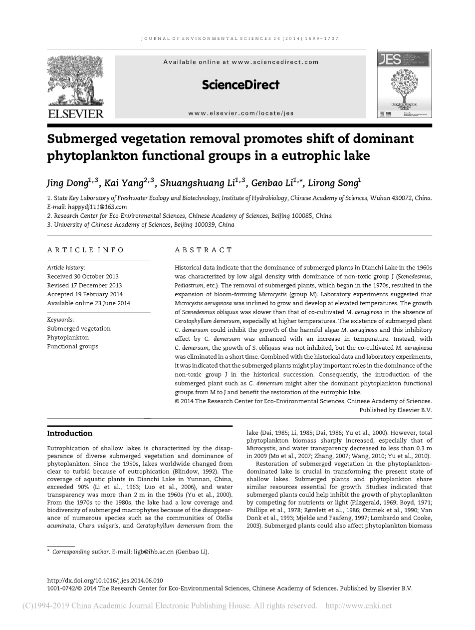 Lu等人(2012)表明,滇池水下植物的恢复可以将退化的生态系统恢复到接近其原始状态的生物多样性水平。然而,该实验没有研究沉水植物对恢复期间优势浮游植物的组成的影响。在本研究中,我们首先将浮游植物功能群理论(Reynolds等,2002,Padisaacute;k等,2009)引入富营养化湖泊。我们提出了一个假设,即沉水植物可以促进富营养化湖泊中浮游植物功能群的结构和组成的变化。