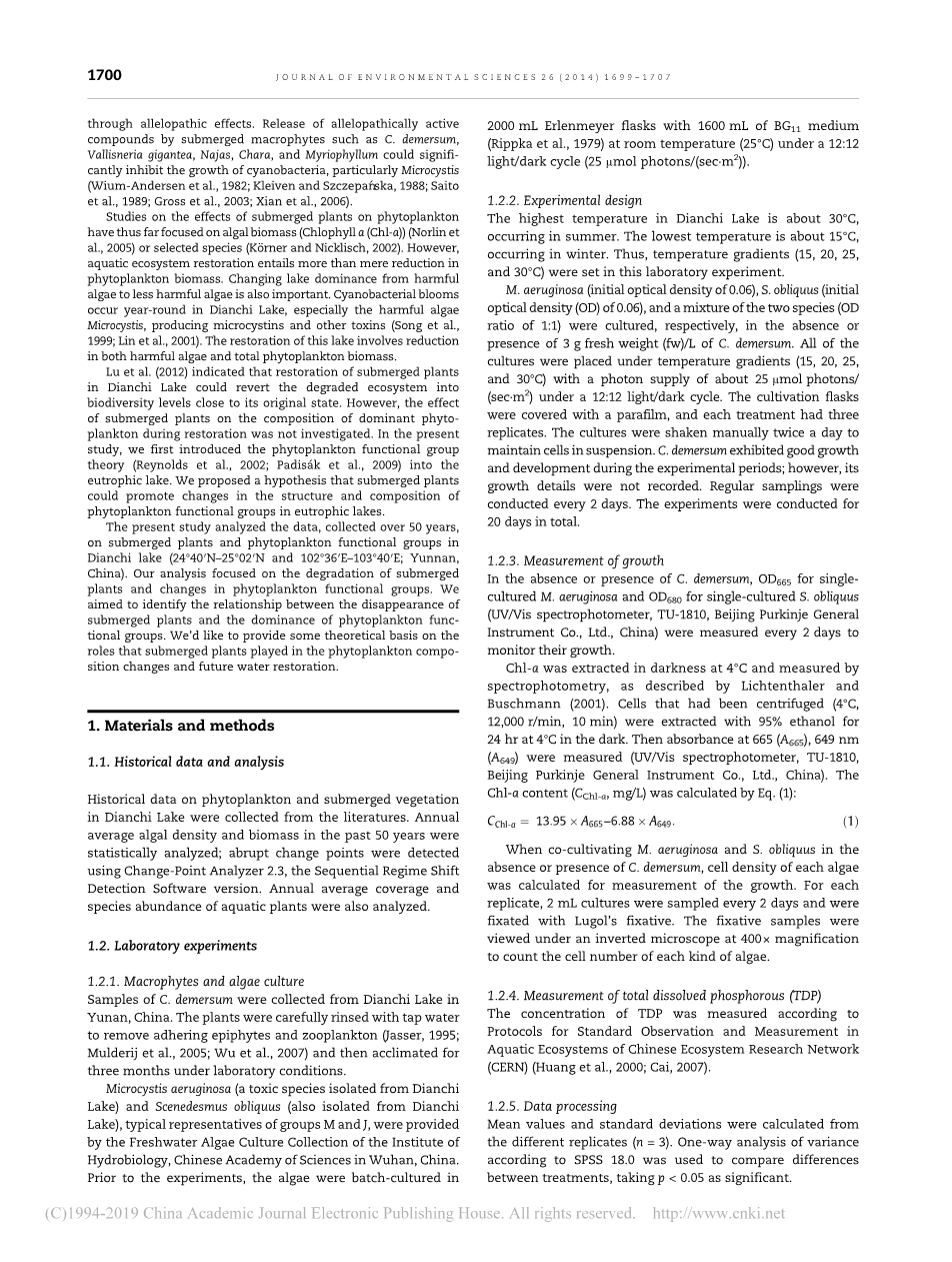 迄今为止,关于沉水植物对浮游植物的影响的研究主要集中于藻类生物量 (叶绿素a (Chl-a)) (Norlin et al., 2005) 或选定的物种(Kouml;rner和Nicklisch,2002 )。然而,水生生态系统的恢复不仅仅是需要减少浮游植物的生物量。将湖泊优势种从有害藻类转变为危害较小的藻类也很重要。滇池常年出现蓝藻水华,特别是有害藻类Microcystis,产生微囊藻毒素和其他毒素(Song et al.,1999,Lin et al.,2001))。该湖的恢复涉及减少有害藻类和浮游植物总生物量。