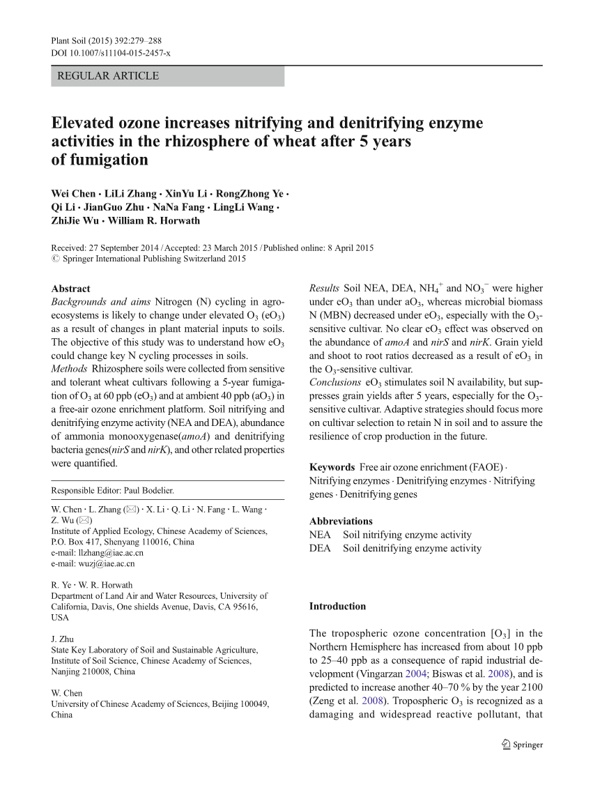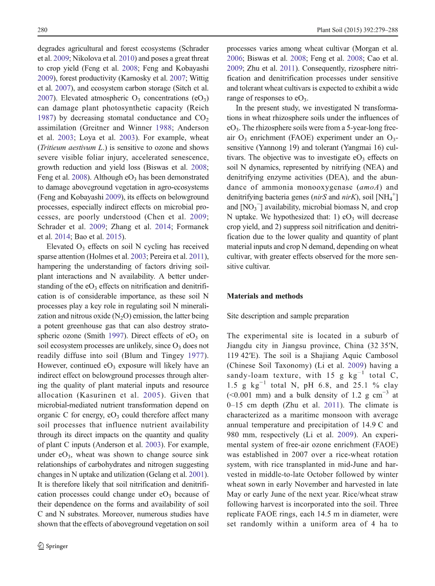 由于工业的快速发展,北半球的对流层臭氧浓度[O3]从大约10ppb增加到25-40ppb(Vingarzan)2004;Biswas等。2008)预计到2100年将再增加40-70%(Zengetal。2008)。对流层O3被认为是一种具有破坏性且广泛存在的反应性污染物,降低农业和森林生态系统(Schraderetal。2009;Nikolova等。2010)并对作物产量构成巨大威胁(Fengetal。2008;冯和小林2009),森林生产力(Karnosky等。2007;Wittig等人。2007)和生态系统碳储存(Sitch等。2007)。升高的大气O3浓度(eO3)会破坏植物的光合能力(Reich1987)通过降低气孔导度和CO2同化(Greitner和Winner1988;安德森等人。2003;Loya等。2003)。例如,小麦(TritieumaestivumL.)对臭氧敏感,表现出严重的可见叶面损伤,加速衰老,生长减少和产量损失(Biswas等。2008;冯等人。2008)。虽然eO3已被证明会破坏农业生态系统中的地上植被(Feng和Kobayashi2009),它对地下过程的影响,特别是对微生物过程的间接影响,知之甚少(Chenetal。2009;施拉德等人。2009;张等人。2014;Formanek等人。2014;鲍等人。2015).升高的O3对土壤N循环的影响受到了极少的关注(Holmes等。2003;佩雷拉等人。2011),妨碍了对驱动土壤-植物相互作用和氮可用性的因素的理解。更好地理解eO3对硝化和反硝化的影响是相当重要的,因为这些土壤氮过程在调节土壤氮矿化和氧化亚氮(N2O)排放中起着关键作用。,后者是一种强效温室气体,也可以破坏平流层臭氧(史密斯1997)。由于O3不易扩散到土壤中,因此eO3对土壤生态系统过程的直接影响不太可能(Blum和Tingey)1977)。然而,通过改变植物材料投入和资源分配的质量,持续的eO3暴露可能会对地下过程产生间接影响(Kasurinen等。2005)。鉴于微生物介导的营养转化依赖于有机碳的能量,因此eO3可能通过其对植物C投入的数量和质量的直接影响影响许多影响养分可用性的土壤过程(Anderson等。2003)。例如,在eO3下,小麦被证明可以改变碳水化合物和氮的源汇关系,表明氮的吸收和利用的变化(Gelangetal。2001)。因此,土壤硝化和反硝化过程可能会在eO3下发生变化,因为它们依赖于土壤C和N底物的形态和可用性。此外,大量研究表明地上植被对土壤的影响小麦品种间的过程各不相同(Morgan等。2006;Biswas等。2008;冯等人。2008;曹等人。2009;朱等人。2011)。因此,敏感和耐受小麦品种下的根际硝化和反硝化过程预计会对eO3产生广泛的反应。