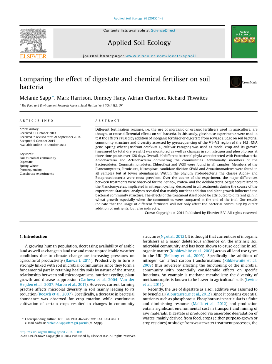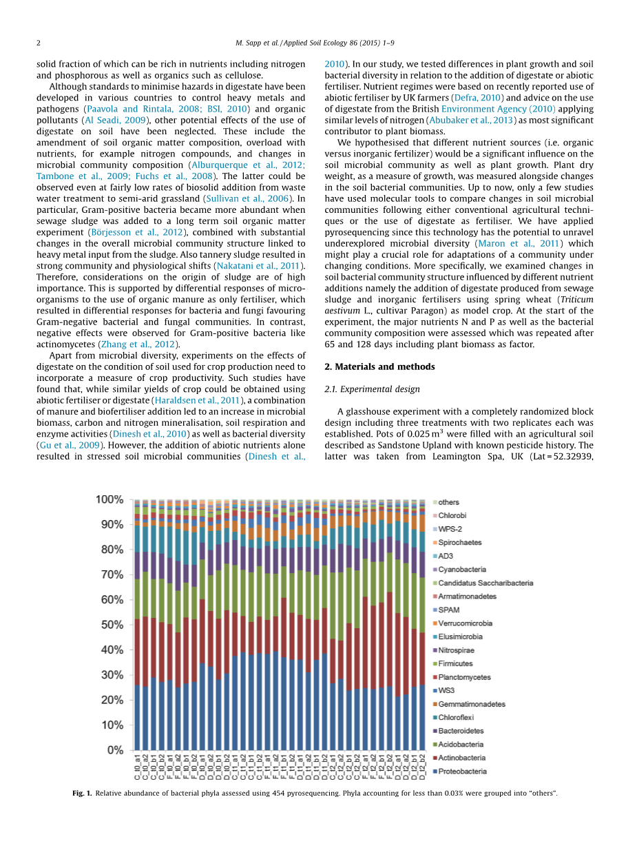 除微生物多样性外,关于消化物对用于作物生产的土壤条件的影响的实验需要纳入作物生产力的测量。这些研究发现,虽然可以使用非生物肥料或消化物获得类似的作物产量(Haraldsen.et.al,2011),但添加肥料和生物肥料的组合导致微生物生物量、碳和氮矿化、土壤呼吸和酶活性(Dinesh.et.al,2010)以及细菌增加。l多样性(Gu.et.al,2009)。然而,仅添加非生物营养素就导致了土壤微生物群落的压力(Dinesh.et.al,2010)。在我们的研究中,我们测试了植物生长和土壤细菌多样性与添加消化或非生物肥料的关系。营养状况是基于英国农民最近报告使用的非生物肥料(defra,2010)和英国环境署(2010)关于使用消化物的建议,使用的氮素水平(Abubaker et al., 2013)与大多数对植物生物量的重要贡献者相似。