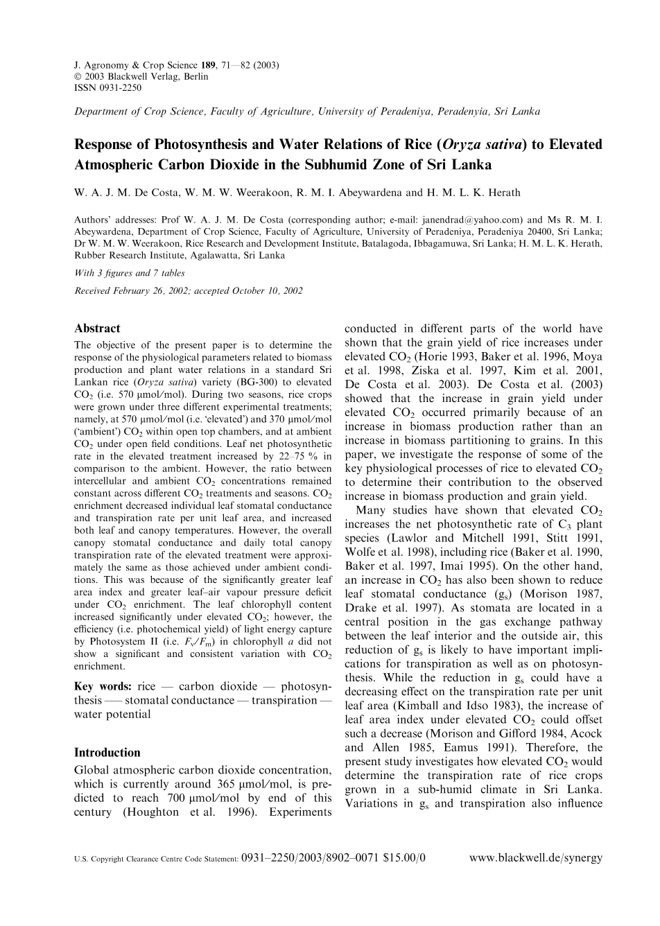 全球大气二氧化碳浓度目前约为365lmol / mol,预计到本世纪末将达到700lmol / mol(Houghton等,1996)。由于二氧化碳的升高,在世界不同地区进行实验的稻米产量明显下降。(Horie 1993,Baker等人,1996,Moya等人1998,Ziska等人1997,Kim等人2001,De Costa等人2003)。 De Costa et al。 (2003)表明,二氧化碳排放量下的粮食产量增加主要是由于生物质产量增加而不是粮食生物量分配的增加。在本文中,我们调查了水稻一些关键生理过程对CO2升高的反应,以确定其对生物量产量和籽粒产量的增加的贡献。许多研究表明,CO2升高可提高C3植物的净光合速率物种(Lawlor和Mitchell 1991,Stitt 1991,Wolfe等1998),包括水稻(Baker等人,1990,Baker等,1997,Imai 1995)。另一方面,二氧化碳的增加也显示出减少叶片气孔导度(gs)(Morison 1987,Drake等,1997)。由于气孔位于叶片内部和外部空气之间的气体交换路径的中心位置,这种gs的减少可能对蒸腾和光合作用具有重要的意义。尽管gs的减少可能具有减小的效果对于单位叶面积的蒸腾速率(Kimball and Idso,1983),CO2浓度升高时叶面积指数的增加可抵消这种下降(Morison和Gifford 1984,Acock and Allen 1985,Eamus 1991)。因此,本研究调查了二氧化碳的升高将如何确定斯里兰卡亚湿润气候中种植的水稻作物的蒸腾速率。gs和蒸腾作用的变化也影响着J.Angronomy&Crop Science 189,71-82(2003)2003柏林的Blackwell Verlag。