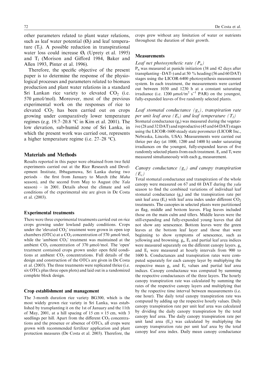 季节),2001年5月至8月(亚拉季节)的第二季度.De Costa等人在“实验场地的气候和土壤条件”中有详细介绍。 (2003)。实验处理对低地稻田条件下种植水稻作物进行了三次实验处理。在CO 2浓度为570lmol / mol的条件下,在CO 2浓度为570lmol / mol的开放顶部室(OTC)中生长CO 2处理作物,而环境CO2处理维持在370lmol / mol的环境CO 2浓度。开放处理包括在环境CO2浓度下在开放野外条件下种植的作物。 De Costa等人提供了OTC设计和构造的全部细节。 (2003)。三种处理方式重复三次(iesix OTCs加三个开放地块),并以随机完整的块设计方式进行。作物建立和管理斯里兰卡最广泛种植的水稻品种BG300是3个月的水稻品种,是通过在2001年1月1日和11日的移植而建立的,山间距为15厘米bull;15厘米,每个山丘有3个幼苗。除了不同的二氧化碳浓度和OTC的存在或不存在之外,所有作物都是用推荐的施肥和植物保护措施种植的(De Costa et al。2003)。因此,作物在其生长期间不增加水分或养分的限制。测量叶片净光合速率(Pn)Pn在穗开始(移栽后38和42天-DAT-)和使用LICOR-6400光合作用测量系统的50%标题(56和60DAT)阶段测量。在每个处理中,在5个随机选择的植物的最小,完全扩展的叶上,在1030和1230h之间以恒定的饱和辐照度(即1200lmol / m 2 s)1 PAR进行测量。气孔导度(gs) ,蒸腾速率每单位叶面积(Et)和叶片温度(T1)在营养(28和32DAT)和生殖(45和64DAT)阶段使用LICOR-1600稳态孔眼测量仪(LICOR Inc)测量气孔导度(gs) 。,Nebraska,Lincoln,USA)。在饱和下每天进行三次(1000,1200和1400h)的测量