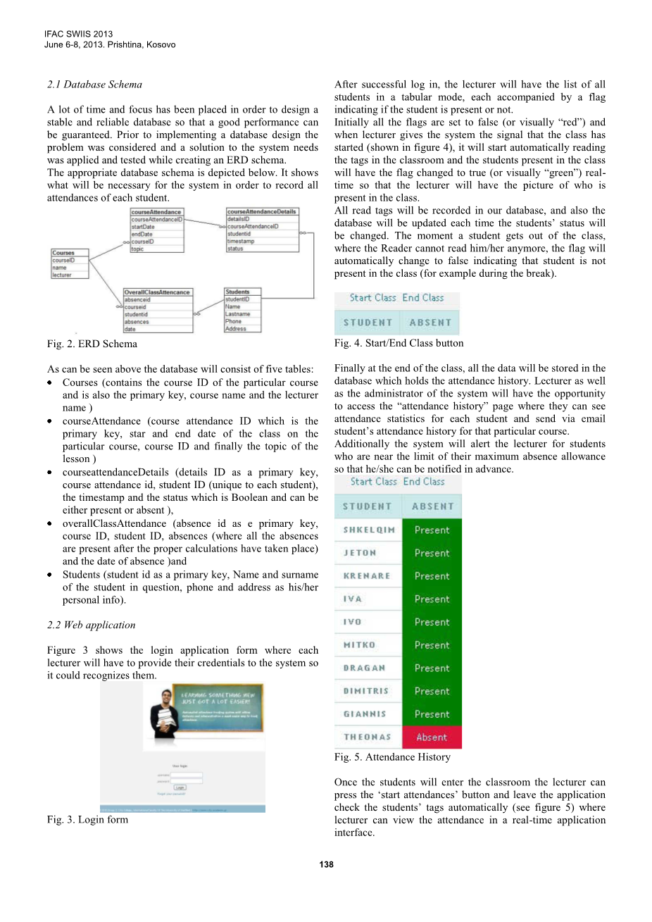最后在一节课结束时,所有的数据都将被存储在保存考勤历史的数据库。 讲师以及作为系统的管理员将有机会访问,他们可以看到“考勤历史”页面和每个学生的考勤统计数据,并通过电子邮件发送学生出席这一特定课程的记录历史。此外,系统将提醒学生的讲师谁接近他们的最大缺勤警告的极限以便他/她可以提前通知。