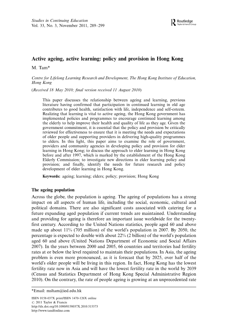 在香港,人口老龄化的必要性对社会的许多方面产生了影响。它影响了社会政策和规划和服务规定,特别是在社会福利、长期护理、医疗保健和退休保障方面。然而,老年人口的另一需求在过去二十年中也得到了相当大的关注。这需要的是教育。