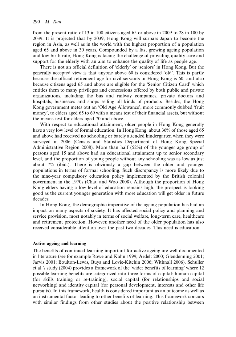 香港政府支持世界卫生组织(WHO)积极的老龄政策框架,其中积极的老化被定义为“优化健康、参与和安全的机会的过程,以提高人们的生活质量”(WHO 2002)。政府明白,参与学习对积极的积极老龄化是至关重要的,并会给老年人带来好处,以改善他们的健康和应付年老时提出的挑战的能力。在许多情况下,包括政策文件和报告、有关高级官员的演讲和公开演讲,政府都提到了学习对积极老龄化的重要性。例如,在香港安老事务委员会的《健康老龄化报告》(2001)中,“长者终身学习”被认为是四个促进发展的策略性方向之一。