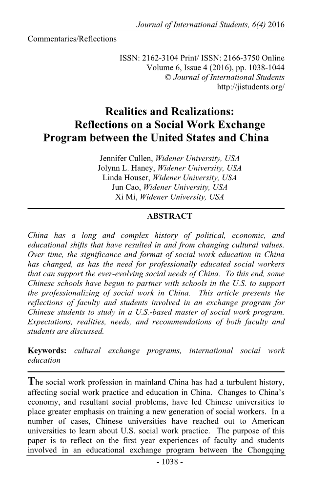 中国大陆的社会工作专业经历动荡,影响着中国的社会工作实践和教育。中国经济的变化以及随之而来的社会问题导致中国大学更加重视培养新一代社会工作者。 在许多情况下,中国的大学已经联系美国的大学了解美国的社会工作实践。本文的目的是反思参与重庆工商大学(CTBU)与美国宾夕法尼亚州韦德纳大学之间教育交流项目的教师和学生的第一年经历。