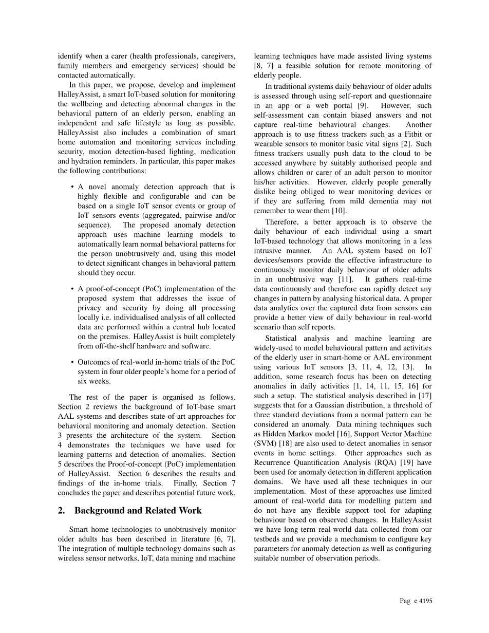 本文的其余部分组织如下。第2节回顾了基于物联网的智能AAL系统的背景,并描述了当前最先进的行为监测和异常检测方法。部分3给出了系统的体系结构。部分4展示了我们用于学习模式和异常检测的技术。部分5描述了HalleyAssist的概念证明(PoC)实现。第6节描述了国内试验的结果和结果。最后,第7节总结了本文,并对未来的工作进行了展望。