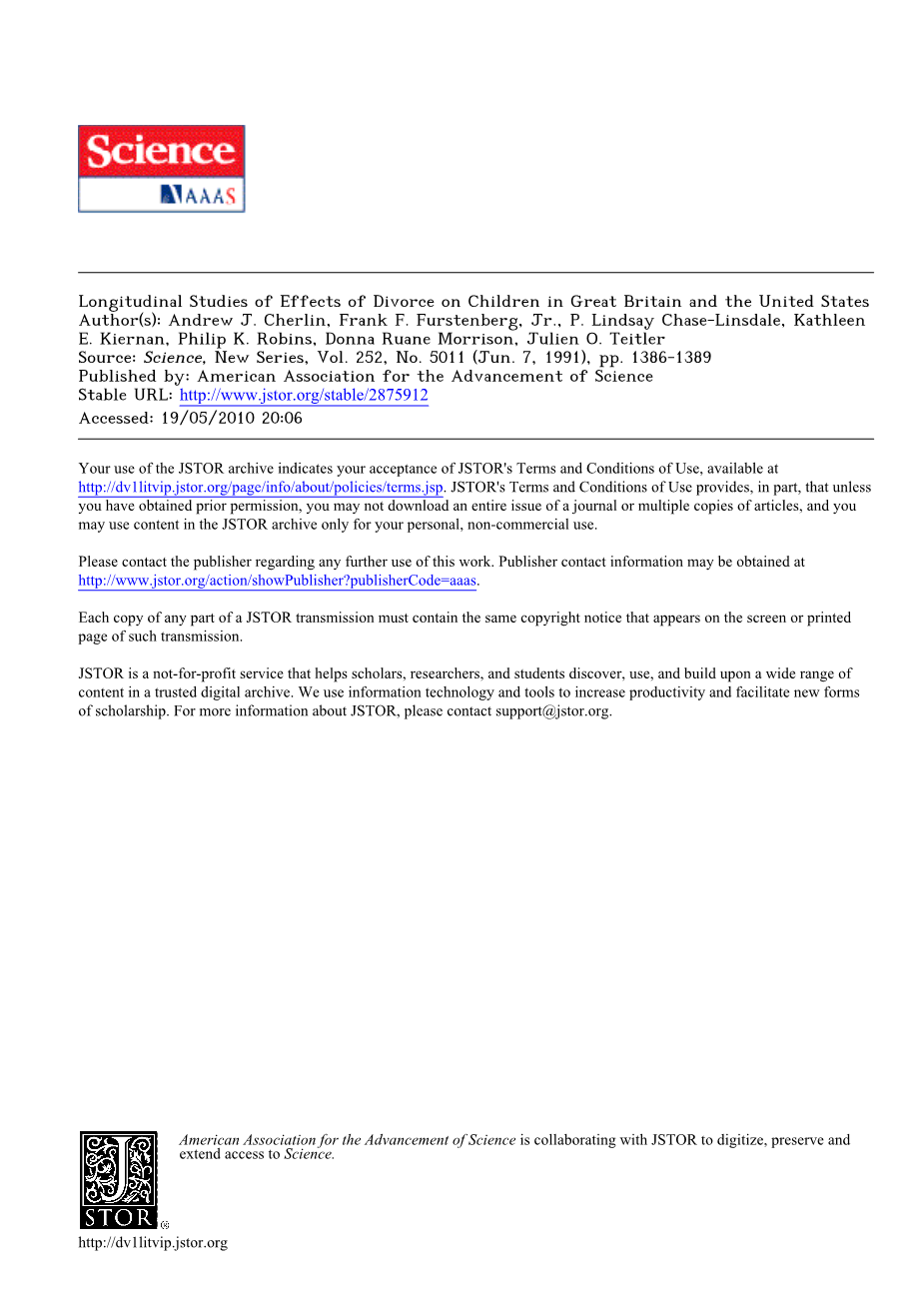 - R.E.Emery, Marriage,Divorce, and Childrens Adjustment(Sage, Beverly Hills, CA, 1988); P.L.Chase-Lansdale and E.M.Hetherington, in Ltfe-Span Development and Behavior,P.B.Baltes,D.L. Featherman,R.M. Lemer, Eds. (Erlbaum,Hillsdale, NJ, 1990), vol.10,pp.105-150;S.S.McLanahan,Am.J.Sociol.94,130 (1988).