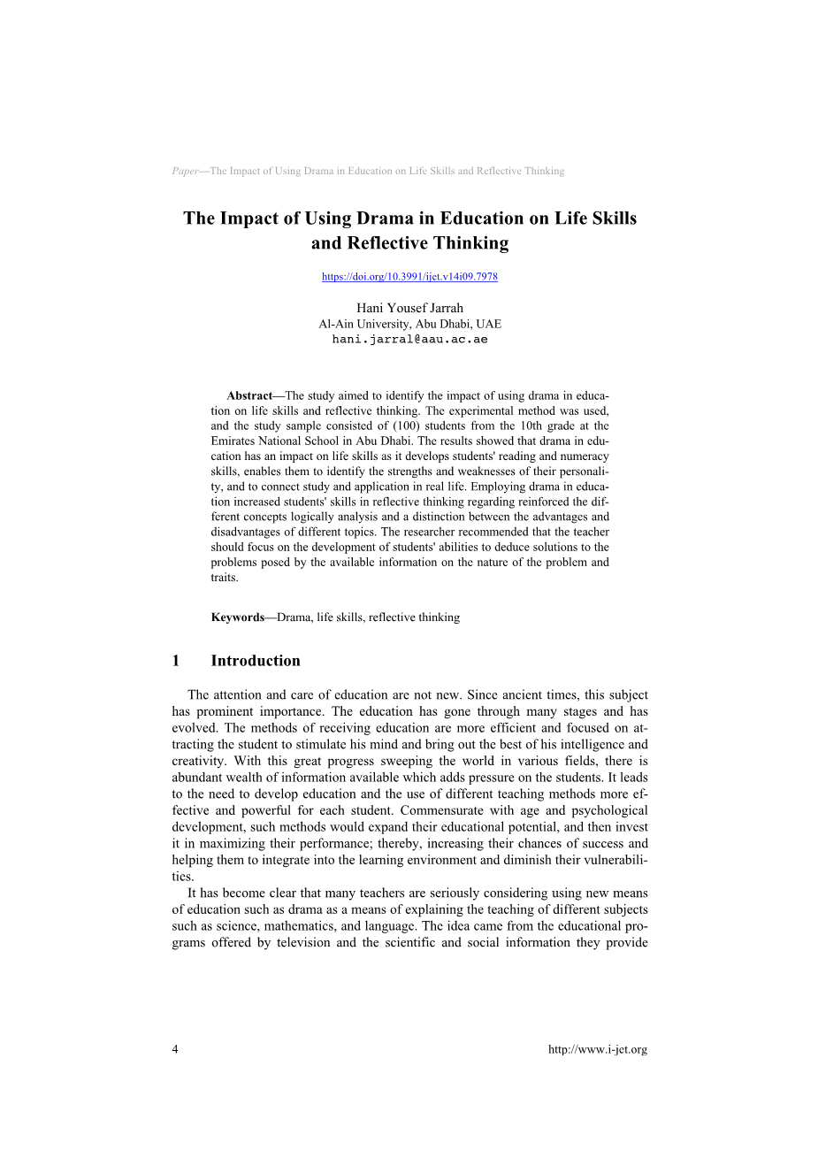 教育戏剧对生活技能和反思性思维的影响外文翻译资料 2023-04-11 11:10:05 英语原文共 17 页,剩余内容已隐藏,支付完成后下载完整资料 英语译文共 11 页,剩余内容已隐藏,支付完成后下载完整资料 资料编号:[590019],资料为PDF文档或Word文档,PDF文档可免费转换为Word 您需要先支付 30元 才能查看全部内容!立即支付 发小红书推广免费获取该资料资格。点击链接进入获取推广文案即可: Ai一键组稿 | 降AI率 | 降重复率 | 论文一键排版 PREVIOUS NEXT 您可能感兴趣的文章 XX市(县)精准扶贫政策执行力提升策略研究文献综述 农民工子女教育融入问题研究开题报告 改革开放以来中国共产党加强党员党性修养的做法及其主要经验研究开题报告 个人奋斗:人格和主观幸福的研究方法外文翻译资料 走向例外论:中国共产党及其对历史的运用外文翻译资料 世界道德观的演变与中国学校道德教育外文翻译资料 学校道德教育:墨守成规还是自治?外文翻译资料 教育戏剧对生活技能和反思性思维的影响外文翻译资料 邢子与荀子对自然的认识外文翻译资料 中学生对数字互动教育活动的偏好的国际研究——用于促进心理健康和心理健康外文翻译资料