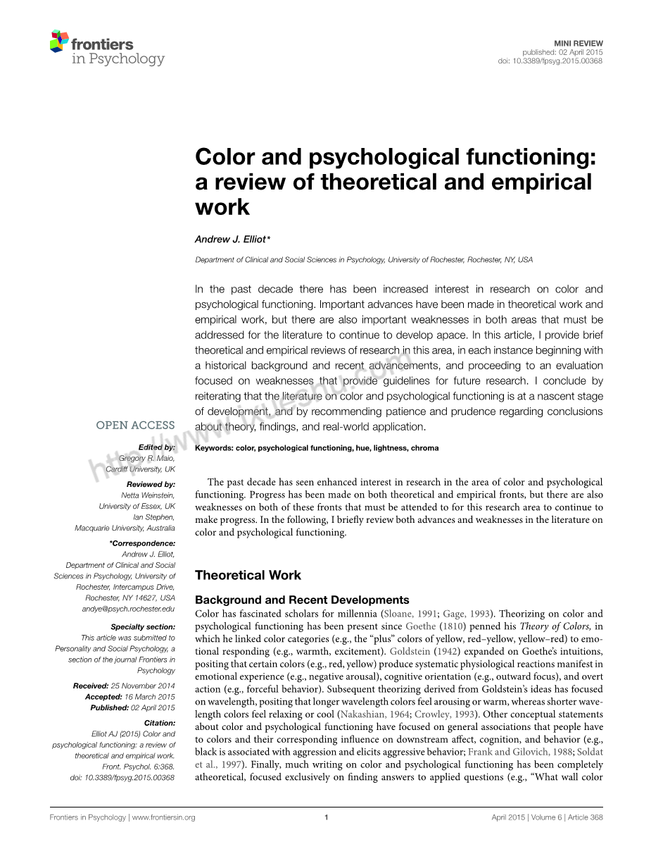 色彩吸引了数千年的学者(斯隆, 1991; 盖奇, 1993)。 自那以后,色彩和心理功能的理论化就一直存在 歌德 (1810)写了他的色彩理论,其中他将色彩类别(例如,黄色,红色黄色,黄色 - 红色的“加号”)与情绪响应(例如温暖,兴奋)联系起来。 戈尔茨坦 (1942)扩展了歌德的直觉,假设某些颜色(例如红色,黄色)在情绪体验(例如负面唤醒),认知定向(例如外部焦点)和明显行为(例如有力行为)中产生系统的生理反应, 。 Goldstein的想法的后续理论着眼于波长,假定较长波长的颜色会觉得兴奋或温暖,而较短波长的颜色会感到放松或凉爽(Nakashian, 1964; 克劳利 1993)。 关于色彩和心理功能的其他概念性陈述集中于人们必须对颜色及其对下游感知,认知和行为的相应影响的一般关联(例如,黑色 与侵略有关并引起攻击行为; 弗兰克和吉诺维奇, 1988; Soldat等人, 1997)。 最后,关于颜色和心理功能的大量文字已经完全没有道理,完全专注于回答应用问题(例如“什么墙颜色促进员工的警觉性和生产力?“)。 上述理论和概念陈述继续激发对色彩和心理功能的研究。 然而,在过去的十年中,还出现了其他几个有前途的理论框架,下面我将回顾这些框架。