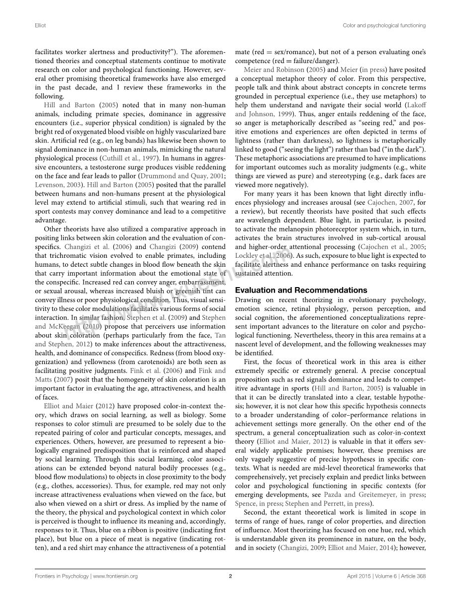 在色彩和选择性注意力的研究中,红色刺激已经出现 显示获得注意优势(见 民间, 在新闻中,进行审查)。 关于色彩和警觉性的研究表明,蓝光增加了基于注意力任务的主观警觉性和表现力(见 Chellappa等人, 2011,审查)。 关于颜色和运动表现的研究已经将红色与更好的表现和体育比赛和任务中的感知表现联系起来(见 Maier等人, 在新闻,审查)。 在色彩和智力表现的研究中,在一项具有挑战性的认知任务之前观看红色已被证明会削弱表现(见 Shi等人l., 2015,审查)。 专注于色彩和攻击性/优势评估的研究表明,在自我或其他方面观看红色会增加对侵略性和主导性的评估(见 Krenn, 2014,审查)。 关于色彩和回避动机的实证研究将成就背景下的观看红色与提高注意力和避免(参见 埃利奥特和迈尔, 2014,审查)。 在色彩和吸引力的研究中,在女性或女性附近观看红色已被证明会增强 异性恋男性的吸引力(参见 Pazda和Greitemeyer, 在新闻,审查)。 关于色彩和商店/公司评估的研究表明,商店/商标上的蓝色增加q诚信和诚信评估(见 Labrecque和米尔恩, 2012,审查)。 最后,关于色彩和饮食/饮酒的经验研究表明,红色影响食物和饮料的感知和消费(见 斯彭斯, 在新闻,审查)。