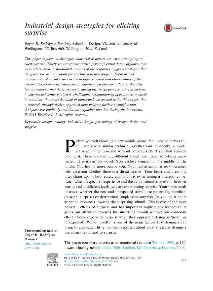 设计师经常依赖于他们的直觉和知情的经验来制作引起惊喜的对象。然而,很少有人报告说,如果设计者想要突击,他们可能会采取什么策略来处理项目。有时,设计师本身在设计过程中会感到惊讶,这也是他们可以拥抱创造令人惊奇的设计的策略。 Scho强调设计师反思(Scho,n。,1983;第76e104页)。他描述了设计师如何正常地面对复杂的情况,“设计者”的移动倾向于高兴地或不快乐地产生除意图之外的后果(Scho n,1983,第79页)。这些意想不到的后果可能会让设计师感到遗憾。 Soo Meng(2009)重申了这一观点,并表明设计过程本质上是流动的,因为实现一个设计目标的目的并不在于闪烁;而是通过自发而无意地发现的新目标是开放的(2009,第64页)。通过这种流体过程,设计人员对自己的实验和开发设计感到惊讶;而且经常由于这个过程,他们可能会让他们的客户感到惊讶。尽管西蒙对设计作为一个线性过程的描述,Soo Meng(2009,pp。62e63)澄清了西蒙如何将设计描绘成一种流畅的活动,其中每一步的实施创造了一个新的情况,反过来又要求一个新的设计动作。在本文中,我们将介绍设计人员在自己的设计过程的阶段报告惊喜的例子,这反过来又要求新的设计动作,并产生令人惊奇的设计。然而,本文的重点是报告设计师用来使他们的客户感到惊奇的策略,而不是自己。