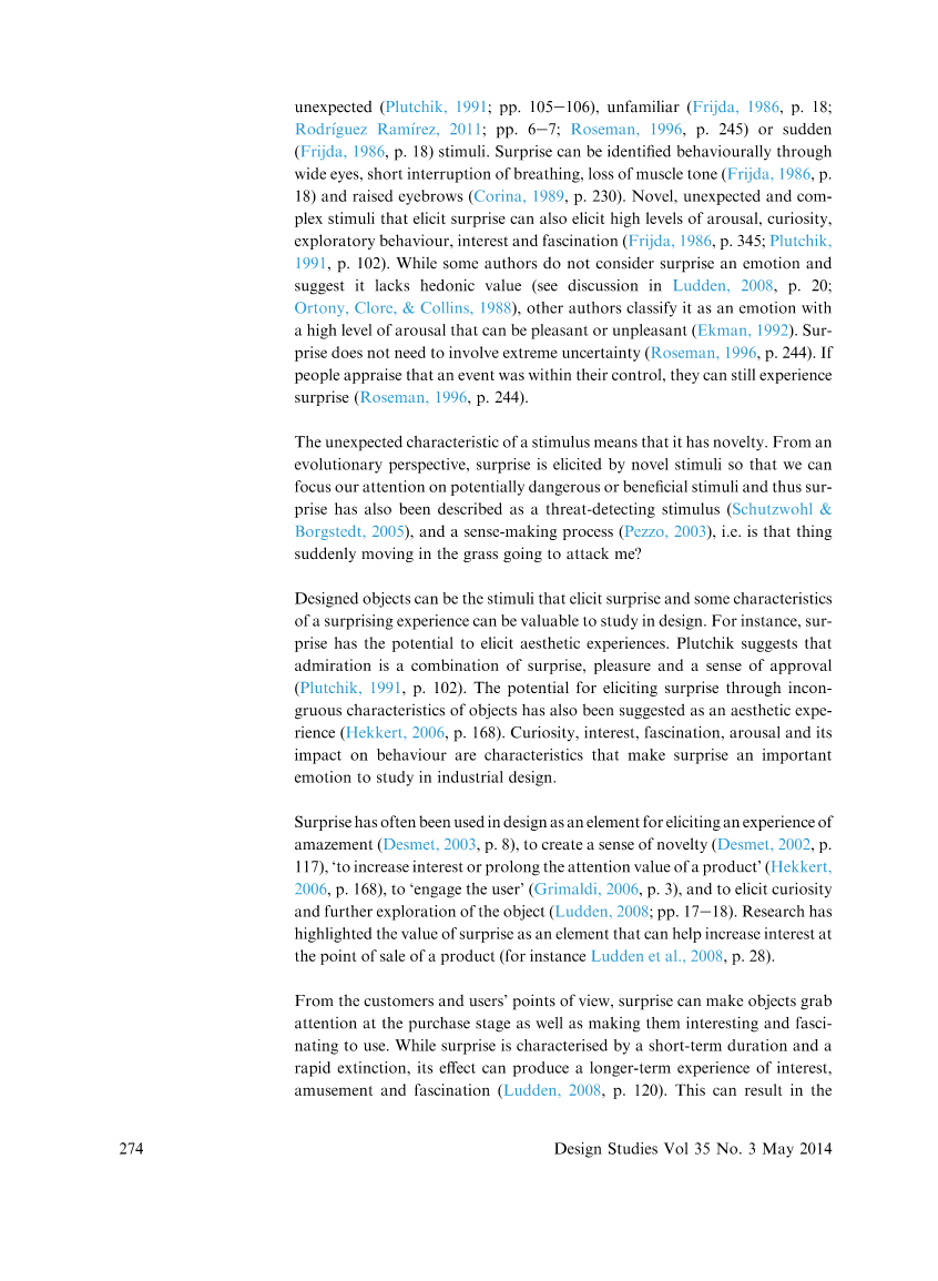 惊喜经常在设计中的作为引发惊奇经验的一个因素(Desmet,2003,第8页),以创造新奇感(Desmet,2002,第117页),“增加兴趣或延长注意力产品价值”(Hekkert,2006,第168页),以 “引导用户”(Grimaldi,2006,第3页),并引出好奇和进一步探索对象(Ludden,2008;第17e18页) 。研究强调了惊喜的价值,作为可以帮助增加产品销售点的兴趣的一个因素(例如Ludden等,2008年,第28页)。