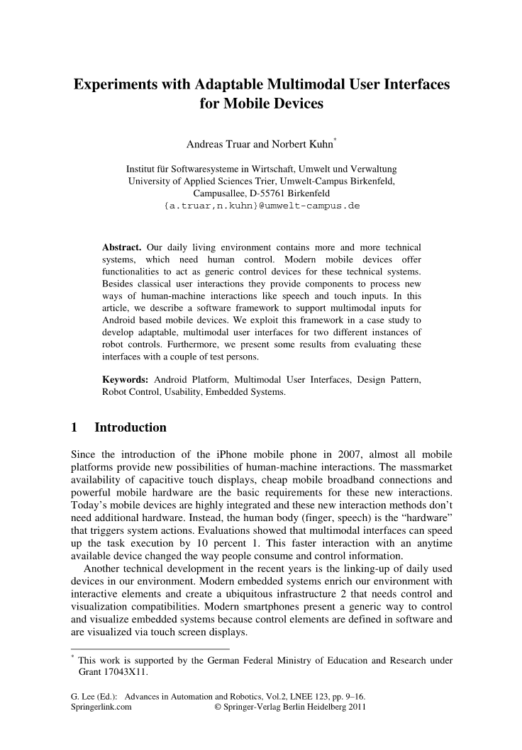摘要:我们的日常生活环境包含越来越多的技术系统,需要人为控制。 现代移动设备提供了用作这些技术系统的通用控制设备的功能。 除了传统的用户交互,它们还提供组件来处理语音和触摸输入等人机交互的新方式。 在本文中,我们描述了一个支持基于Android的移动设备的多模式输入的软件框架。 我们在案例研究中利用此框架为两种不同的机器人控制实例开发适应性多模式用户界面。 此外,我们提供了一些评估这些接口与一些测试人员的结果。