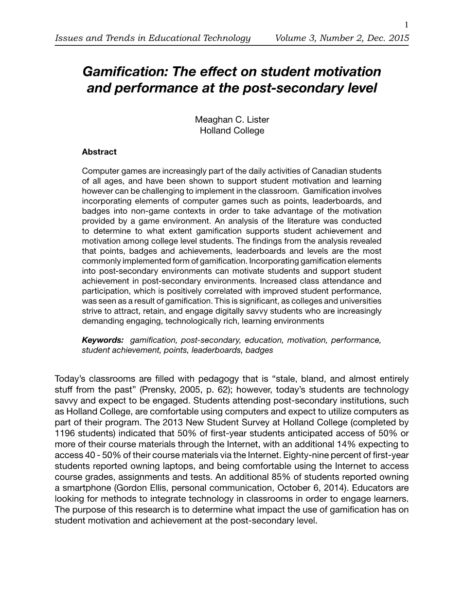 今天的课堂充满了“陈腐、平淡、几乎完全”的教育学。“斯图克来自过去”(Prensky,2005,第62页);然而,今天的学生是技术。悟性和期望订婚。就读大专院校的学生作为荷兰学院,使用计算机是舒适的,并希望利用计算机作为他们计划的一部分。荷兰学院2013次新生入学调查1196名学生表示,50%的学生预计有50%的入学机会。更多的课程材料通过互联网,额外的14%预期通过互联网访问40到50%的课程材料。第一年的百分之八十九学生报告拥有笔记本电脑,使用互联网方便上网。课程等级、作业和测验。另有85%的学生报告拥有智能手机(Gordon Ellis,个人通信,2014年10月6日)。教育工作者寻找在课堂上整合技术的方法,以吸引学习者。本研究的目的是确定游戏使用的影响是什么。高中生的学习动机与成就。