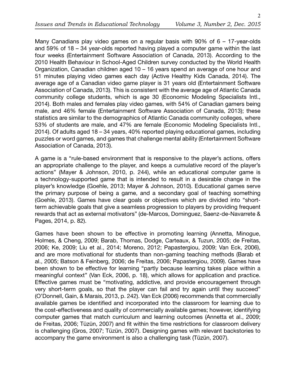 许多加拿大人定期玩视频游戏,6到17岁的青少年中有90%人玩电子游戏。18到34岁的孩子中有59%个在最后一次玩电脑游戏。四周(加拿大娱乐软件协会,2013)。根据世界卫生组织对学龄儿童健康行为的2010项调查组织,加拿大的10至16岁儿童平均花费一个小时每天51分钟玩电子游戏(活跃的健康儿童加拿大,2014)。这个加拿大电子游戏玩家的平均年龄是31岁(娱乐软件)加拿大协会,2013)。这与大西洋加拿大的平均年龄是一致的。社区学院的学生,年龄30岁(经济建模专家国际,2014)。男性和女性都玩视频游戏,54%的加拿大玩家正在玩游戏。男,女46%人(加拿大娱乐软件协会,2013);统计数据类似于大西洋加拿大社区学院的人口统计数据。53%的学生是男性,47%是女性(国际经济建模专家,2014)。在18岁到34岁的成年人中,有40%人玩教育游戏,其中包括智力游戏或游戏,挑战智力能力的游戏(娱乐软件)加拿大协会,2013)。