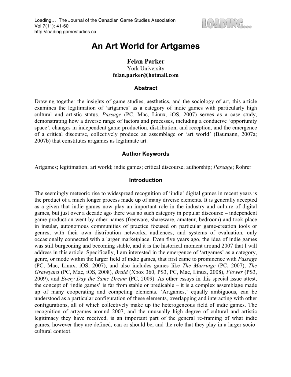 社会学家席昂·伯曼提出,艺术品或者实践如何成为艺术,是由三个因素所驱动:传统领域以外的变化是首要条件,这创造了一个“机会空间”;制度的转变使其生产、分配和消费有了新的变化;对它价值和意义所出现的批判性的言论。他认为这三个因素共同产生了以文化形式构成并维持的“艺术世界”。在20世纪60年代好莱坞的案例研究中,他指出了早期欧洲艺术电影的机会空间,制度转向以导演为导向的生产模式,与法国“导演中心论”纳入了美国电影评价,是好莱坞电影在艺术世界的发展的关键因素。像是过去的流行文化形式,包括电影、流行音乐、舞蹈、漫画、电视剧。数字游戏现在也正处于作为艺术被人接受的过程。在本文中,我将用《通道》作为主要例子,基于伯曼的概念框架探讨艺术游戏的现象。怎样的原始结构为“艺术游戏”产生了机会空间?怎样的制度变化使得像杰森·罗勒这样的开发者把自己的作品定义为艺术作品,而不是娱乐产品?《旅程》是如何被评论家和相关专家定义为艺术作品的呢?
