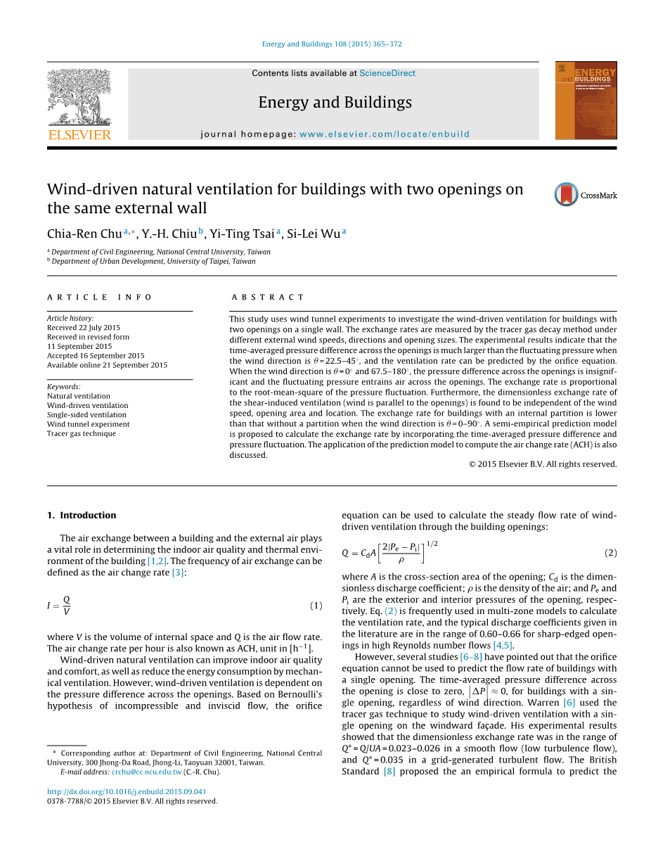 其中A是开口的横截面积; Cd是无量纲放电系数; rho;是空气的密度; Pe和Pi分别是开口的外部和内部压力。方程式(2)经常用于多区域模型中以计算通风率,文献中给出的典型放电系数在高雷诺数流动的尖锐开放度范围内在0.60-0.66范围内[4,5 ]。