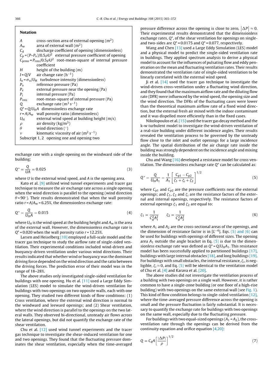 其中A1和A2是开口的横截面积,并且电阻系数的尺寸在。 方程式(5)和(6)可用于具有不同尺寸的开口的建筑物。方程式中的中括号外的开口区域A1。方程式(5)是由于无量纲的交换率被定义为。这种抵抗模式已经成功应用于分区建筑[17],内部障碍大的建筑物[18]和长建筑物[19]。对于障碍内阻小的建筑物,Chu等人[4]和Karava等人[20]认为zeta;i可以认为zeta;iasymp;0,等式 (5)将与通风模式相同。