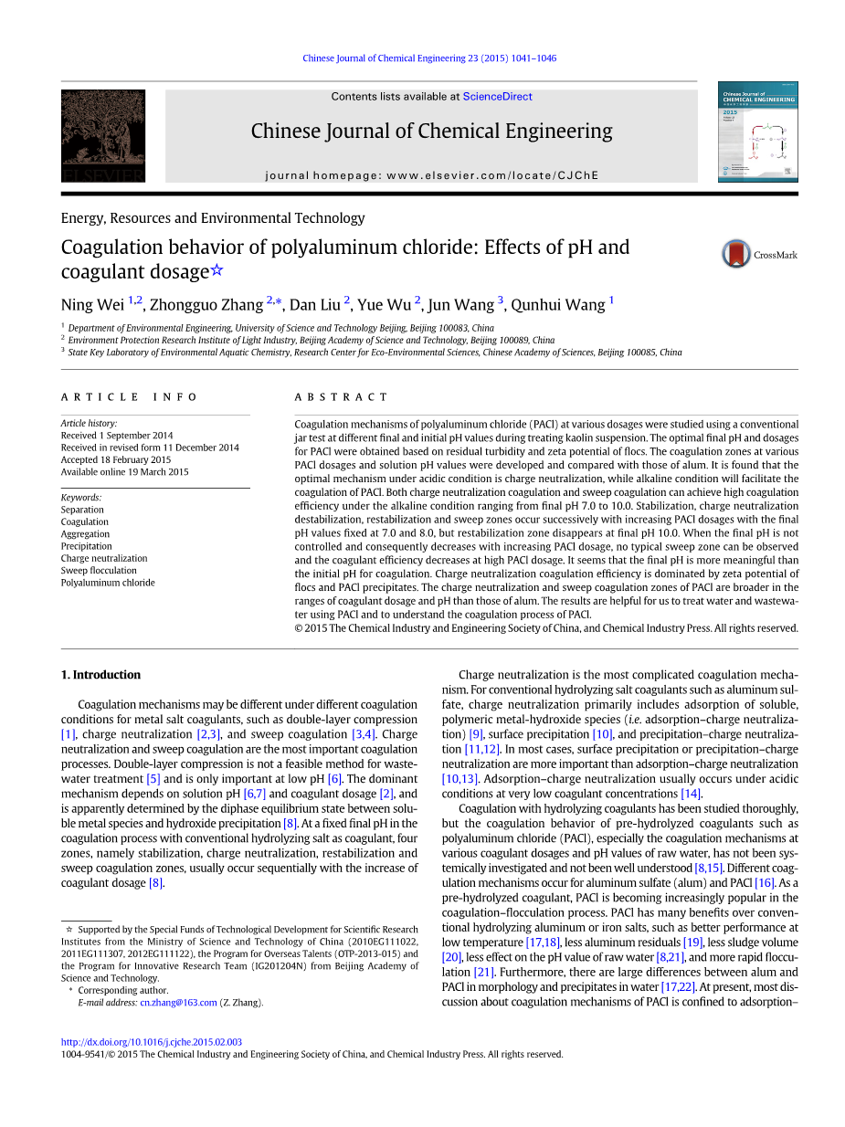 在处理高岭土悬浮液时,使用不同最终和初始pH值的常规罐测试来研究不同剂量的聚合氯化铝(PACI)在的混凝机理。聚合氯化铝的最优最终pH值和剂量在絮体的剩余浊度和电动电势的基础上获得。对各种聚合氯化铝剂量和溶液pH值下的凝固区进行开发,并与明矾比较,发现在酸性条件下的最优机制是电荷中和,而碱性条件有利于聚氯化铝的混凝。电荷中和混凝和卷扫混凝都可以在最终pH值为7.0至10.0的碱性条件下实现高凝固效率。稳定化,电荷中和不稳定,重新稳定和卷扫区域随着聚合氯化铝剂量的增加而连续出现,最终pH值固定在7.0和8.0之间,但在最终pH值为10.0时,再稳定区消失。当最终pH不受控制并随着聚合氯化铝剂量的增加而降低时,就不能观察到典型的卷扫区域,并且在聚合氯化铝剂量高的情况下混凝剂效率会降低。似乎对混凝而言,最终的pH值比初始pH值更有意义。电荷中和凝固效率是以絮凝体和聚合氯化铝沉淀物的电动电位为主。聚合氯化铝的电荷中和和卷扫混凝区在凝结剂用量和pH值的范围上比明矾更广。研究结果有助于我们采用聚合氯化铝来处理水和废水以及了解聚合氯化铝的混凝过程。