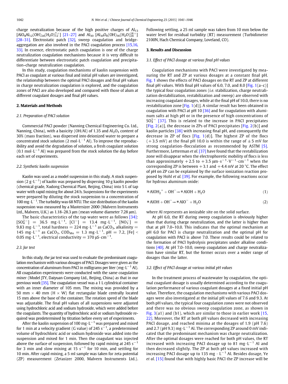 在制备100mg·L-1的高岭土悬浮液并以245s-1的速度梯度(G值)混合1分钟后,将预定体积的盐酸或氢氧化钠加入悬浮液中并混合1分钟。 然后将凝结剂注入悬浮液表面,然后在245s-1下快速混合3分钟,并在15s-1下缓慢混合10分钟,沉降10分钟。 快速混合后,取5 ml样品进行zeta;电位(ZP)测量(电位分析仪 2000,马尔文仪器有限公司)。沉降后,从水位以下10毫米取出25毫升样品进行剩余浊度(RT)测量(浊度仪 2100n,哈希化学公司,拉夫兰,CO)。