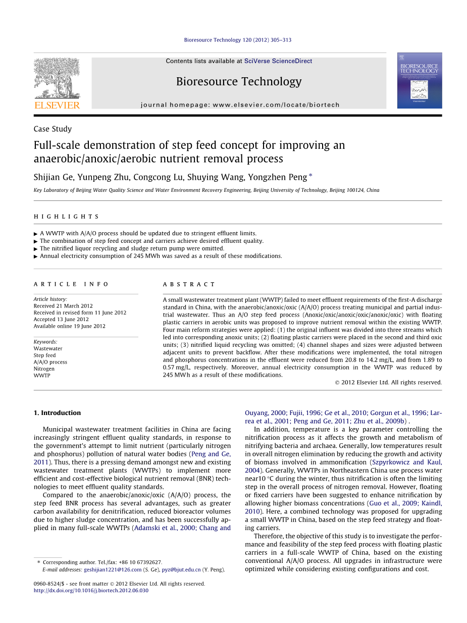 关键词:废水;分步进料;A/A/O过程;氮;污水处理厂