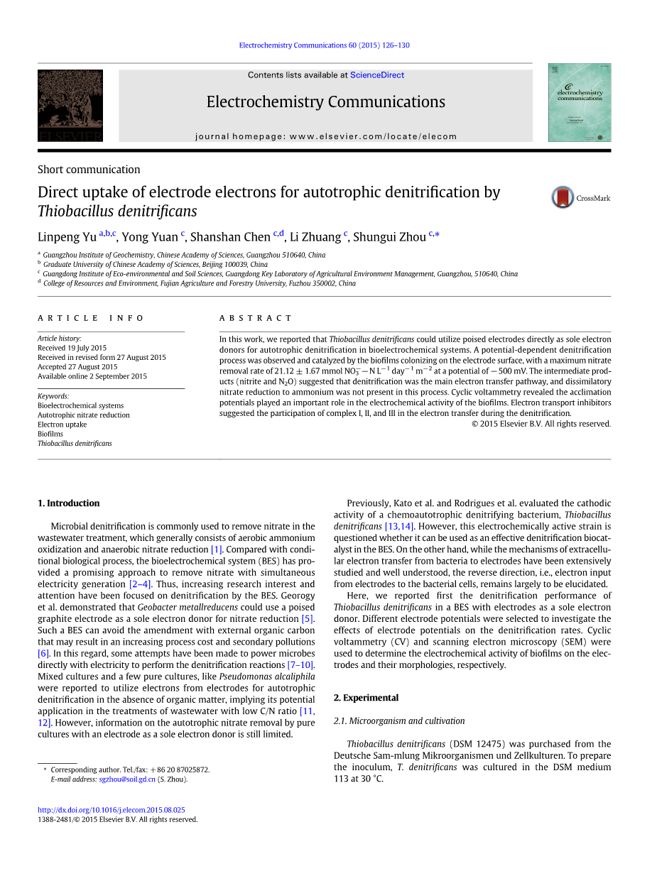 此前,加藤等人以及罗德里格斯等人曾对化能自养反硝化细菌,即硫杆菌属反硝化菌的阴极活动做出过评估。[13,14]。然而,这种电化学反应链仍受质疑,它是否可以作为生物电化学系统中反硝化催化剂。另一方面,虽然细胞外电子从细菌转移到电极的机制曾被广泛研究和了解, 反方向转移亦然,也就是说,从电极输入到细菌细胞的电子,在很大程度上仍有待阐明。