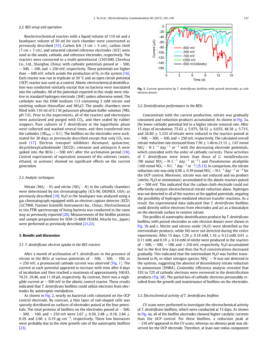 T反硝化菌在装有硝酸盐,拥有-500,minus;300,minus;100或 250 毫伏等不同电位的生物电化学系统中适应了一个月之后,可观察到预期的阴极电流 (图1)。每个电极的电流在培养了四天之后随着时间的流逝而增强,然后达到最大值,大约分别为160.83,76.51,29.46和11.39微安。相比之下,非生物控制反应器中产生了可忽略的电流,为-500毫伏。这些结果表明,T反硝化菌生物膜可以利用来自电极的电子进行自养代谢。