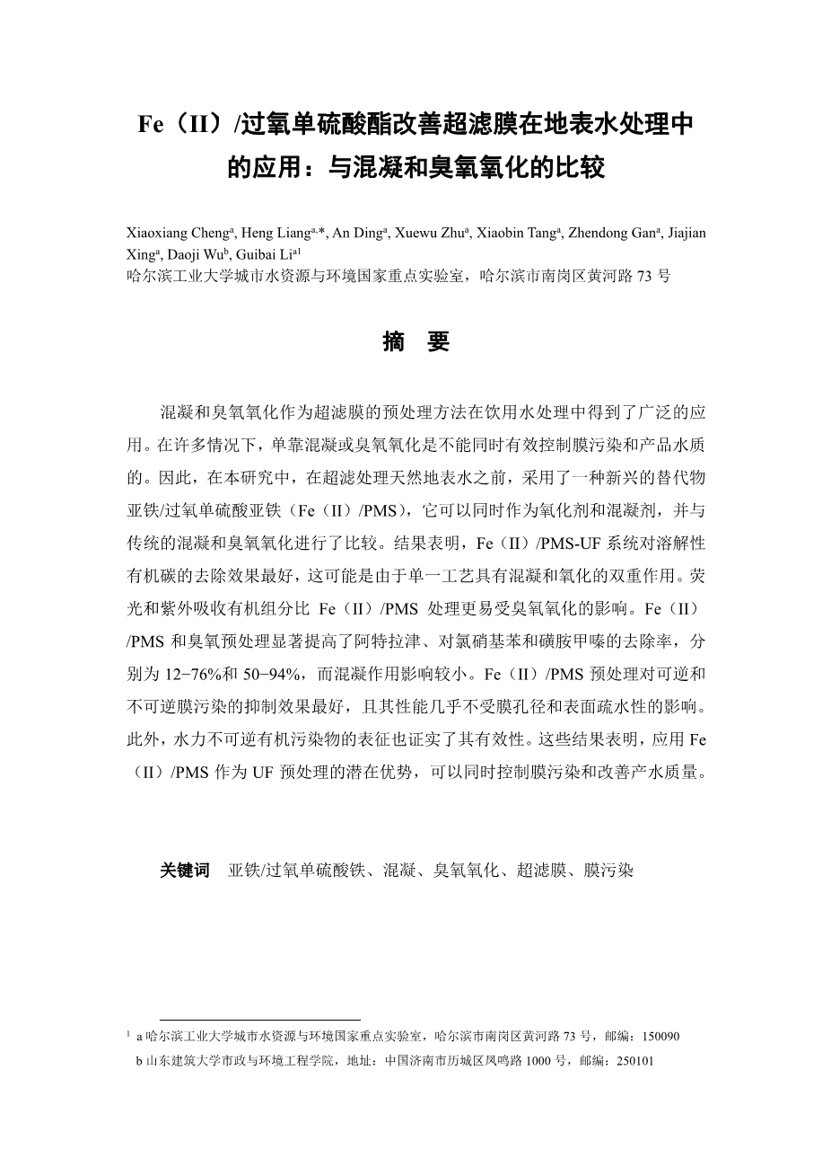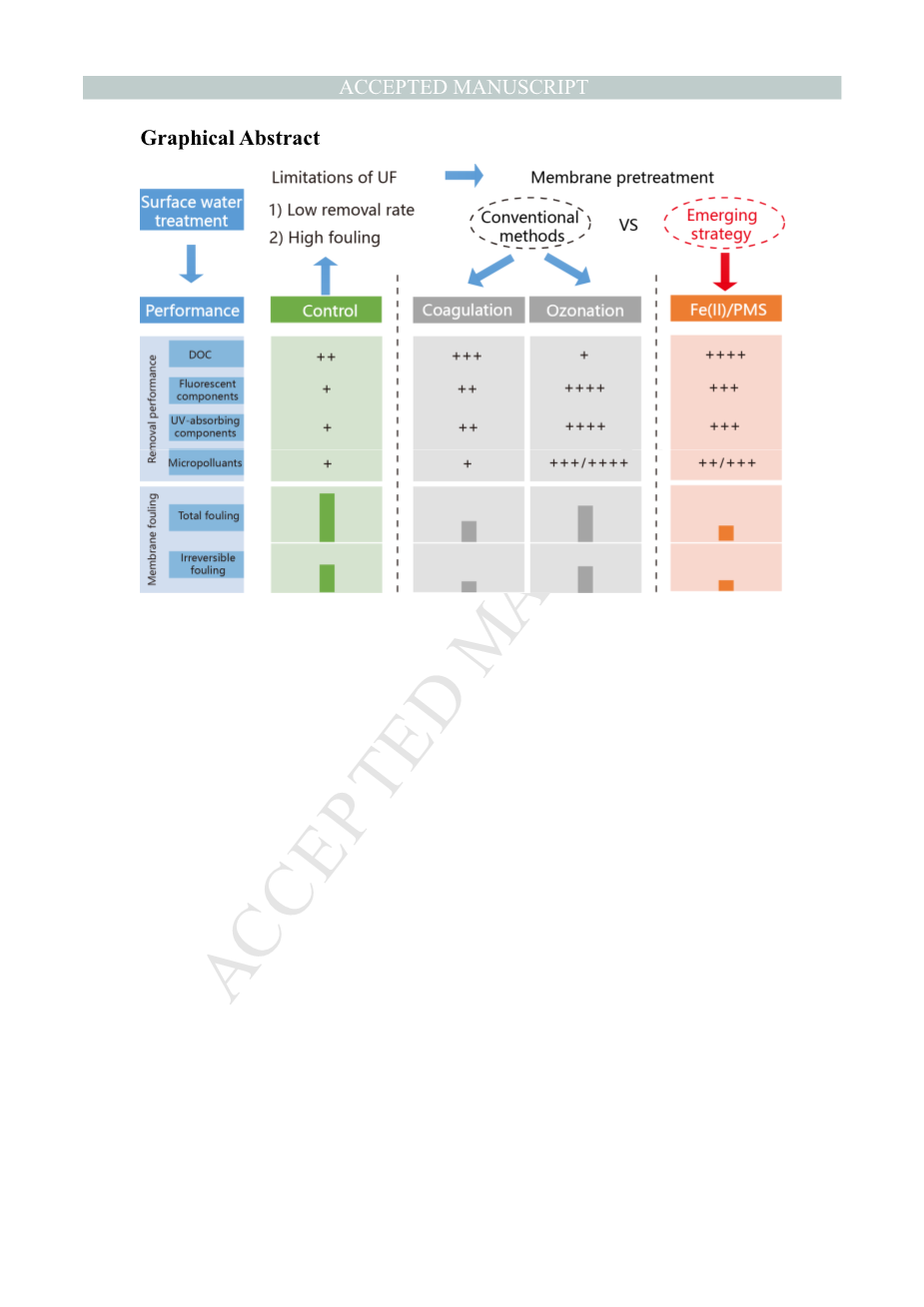 Fe (II) /过氧单硫酸酯改善超滤膜在地表水处理中的应用:与混凝和臭氧氧化的比较外文翻译资料