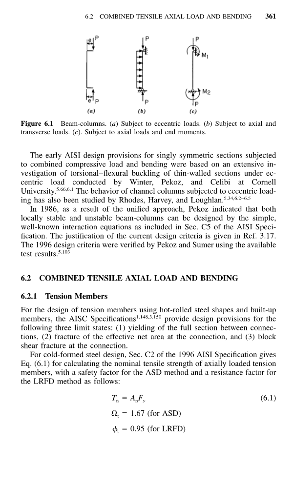 结构构件在拉伸或压缩时常常受到弯曲和轴向荷载的组合影响。在1996版的美国钢铁学会标准中,轴向荷载和弯曲的组合设计规定扩大到包括第C5.1节中拉伸轴向载荷和弯曲组合下冷弯型钢结构构件的特殊要求。