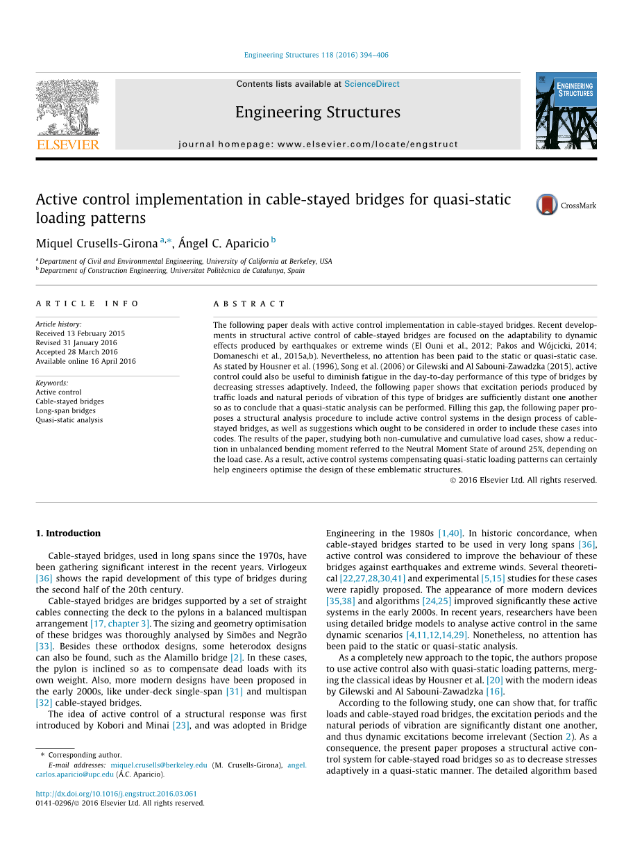 主动控制结构反应的想法是首先由Kobori和Minai提出的,并在20世纪80年代的工程中被使用。在历史的长河中,当斜拉桥开始在较大跨径的工程中使用时,斜拉桥的主动控制改变了桥梁抗震和抗风的性能。一些理论性和实验性的研究被迅速地提出。在21世纪初,更多现代化的仪器和理论的出现使斜拉桥的主动性更加有意义。在最近几年,研究人员一直在使用详细的桥梁模型在相同的动力反应下的主动控制作用,尽管如此,在静态和准静态分析上并没有引起更多关注。作为这个问题的全新方法,作者提出使用主动控制也具有准静态加载模式,并且与Housner等人的古典观念进行融合。伴随着Gilewski和Al Sabouni-Zawadzka的现代理论的逐渐兴起。